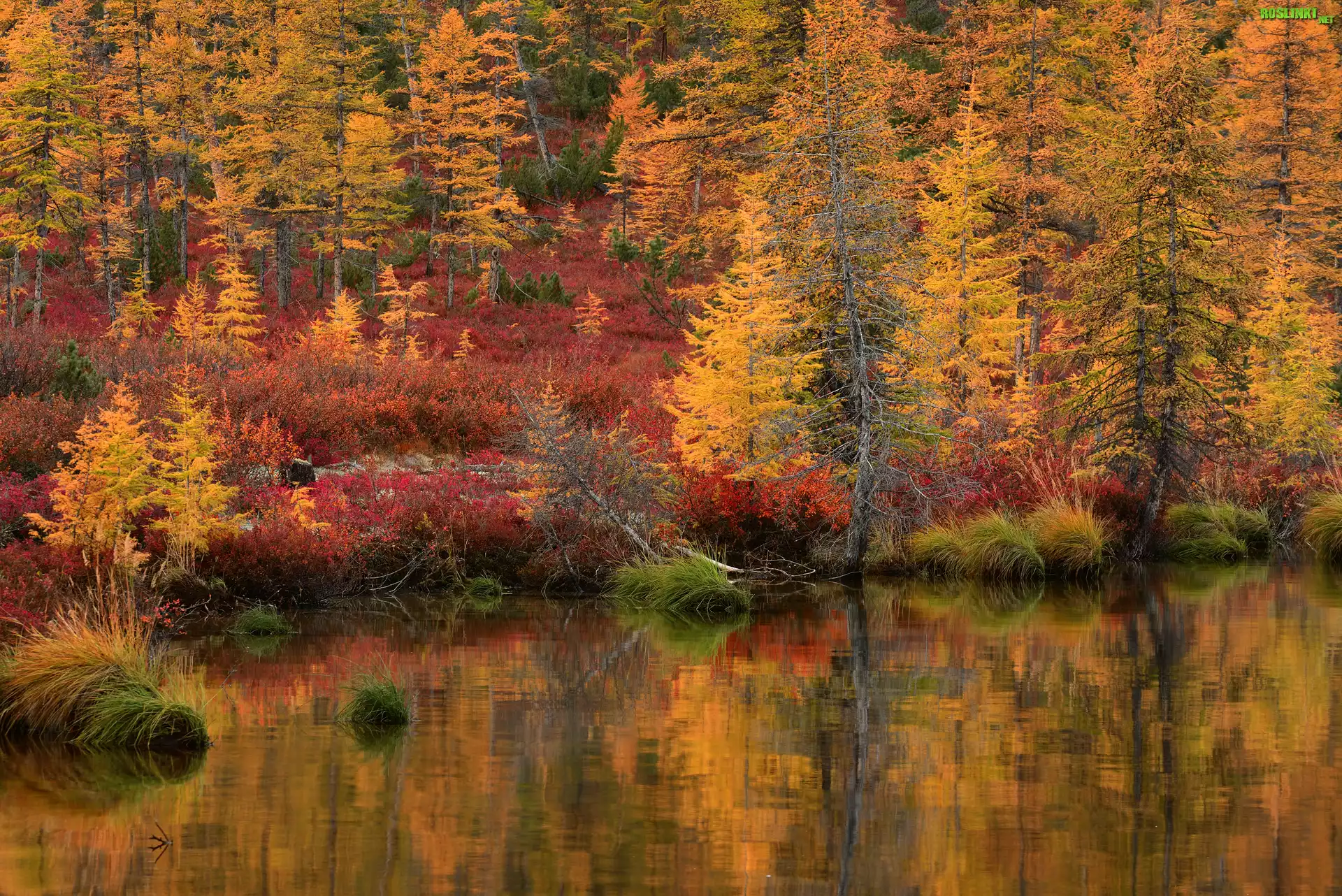 Rośliny: Jesień, Drzewa, Odbicie, Jezioro Jack London, Kołyma, Magadan, Rosja