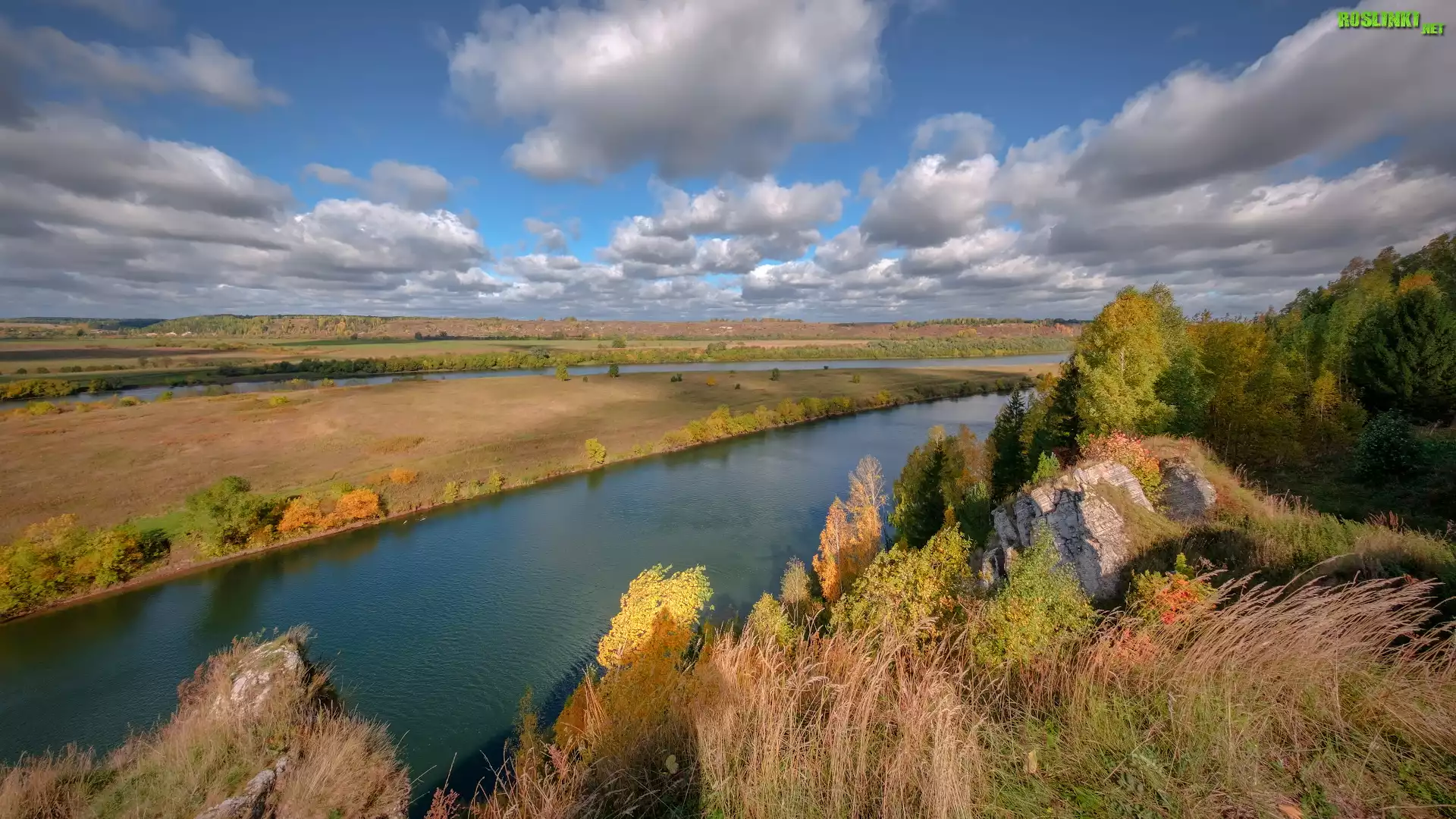 Rośliny: Rzeka Sylva, Pola, Trawy, Drzewa, Chmury, Kraj Permski, Rosja