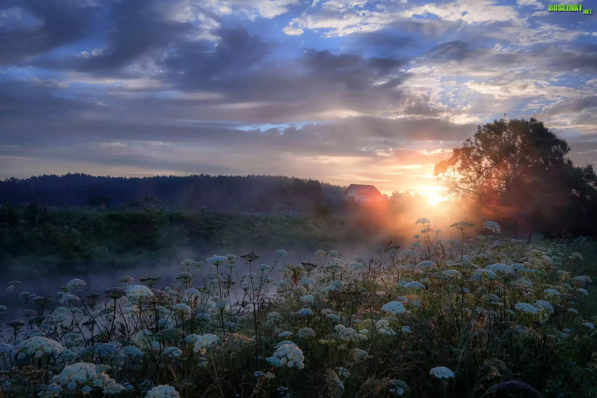 Rośliny: Rzeka Istra, Mgła, Drzewa, Roślinność, Wschód słońca, Obwód moskiewski, Rosja