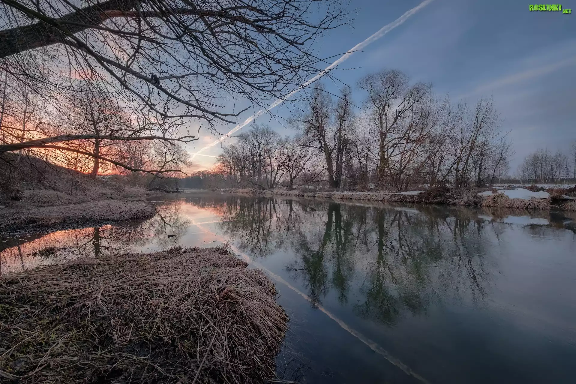 Rośliny: Zima, Drzewa, Rzeka Istra, Zachód słońca, Obwód moskiewski, Rosja