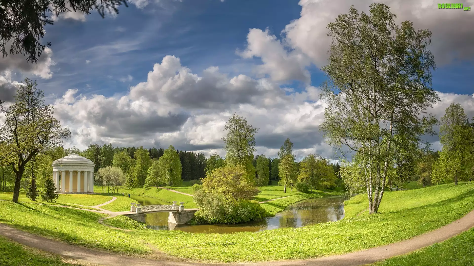 Rośliny: Park, Świątynia Przyjaźni, Mostek, Rzeka Sławianka, Drzewa, Pawłowsk, Petersburg, Rosja
