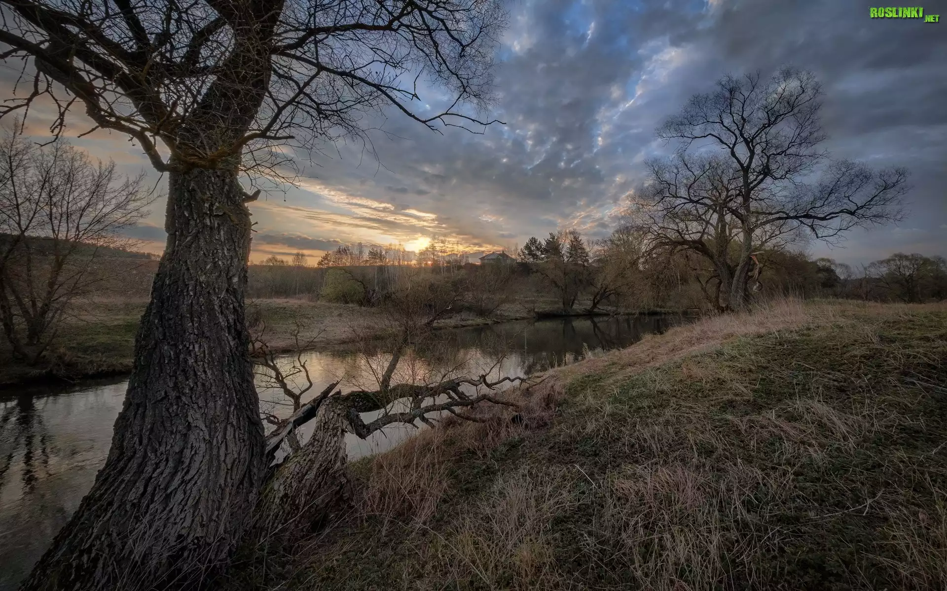 Rośliny: Wschód słońca, Rzeka Istra, Drzewa, Trawa, Obwód moskiewski, Rosja