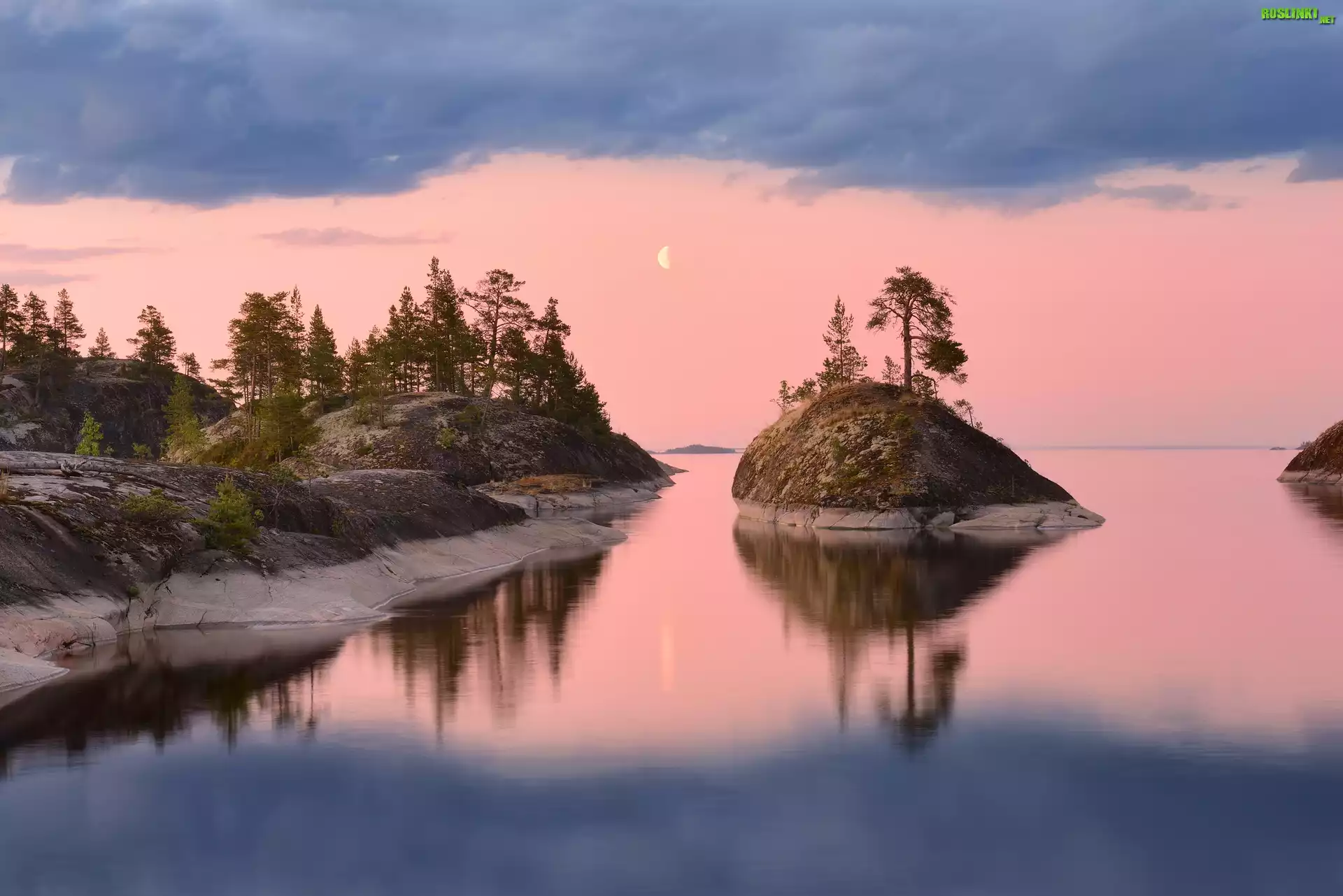 Rośliny: Jezioro, Ładoga, Wyspa, Drzewa, Skały, Zachód słońca, Księżyc, Karelia, Rosja