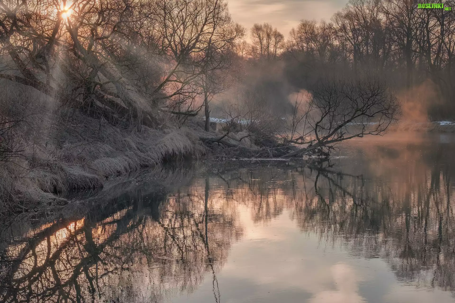 Rośliny: Rzeka Istra, Drzewa, Promienie słońca, Mgła, Odbicie, Obwód moskiewski, Rosja