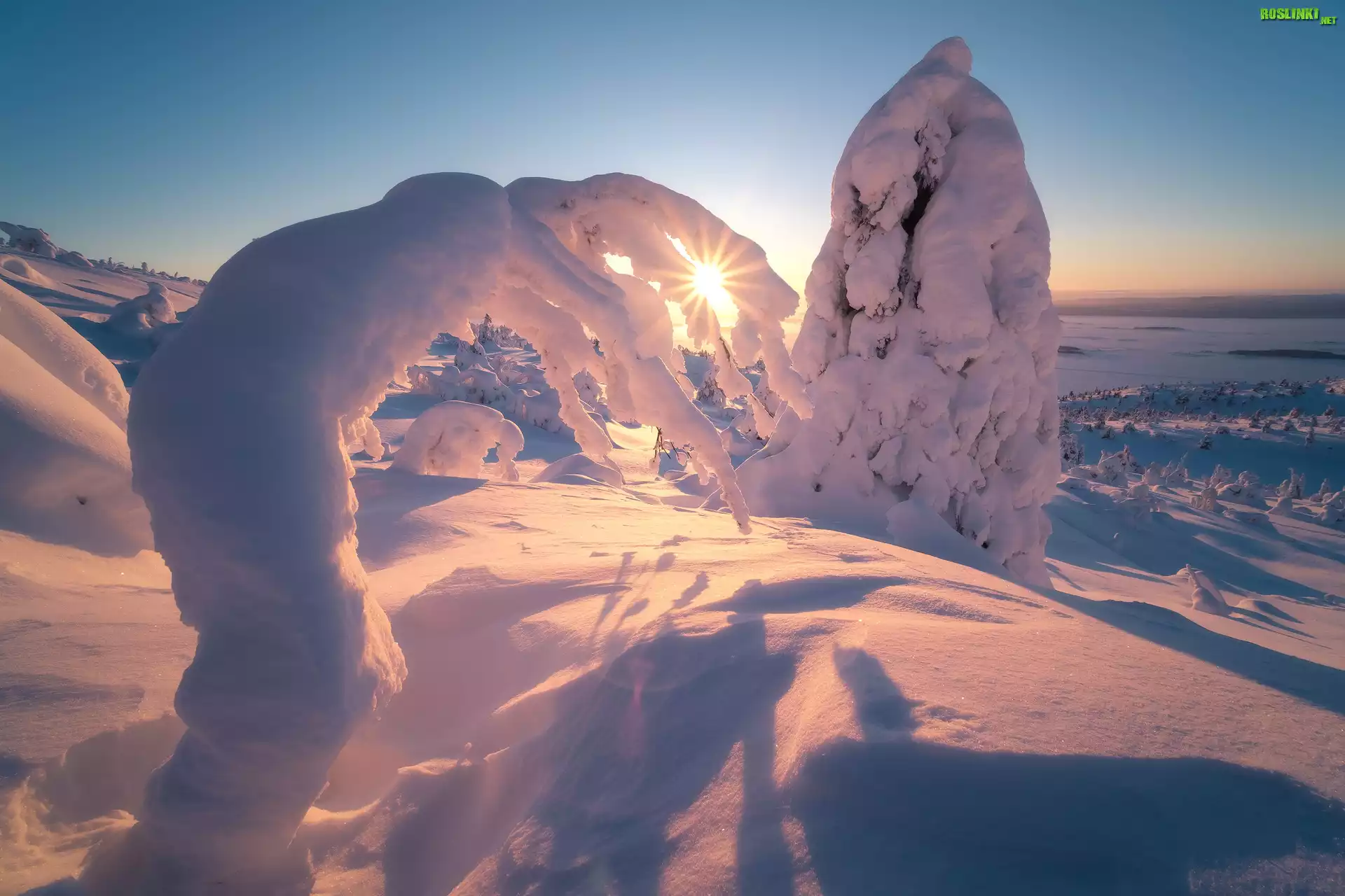 Rośliny: Zima, Ośnieżone, Drzewa, Promienie słońca, Zatoka Kandałaksza, Półwysep Kolski, Rosja