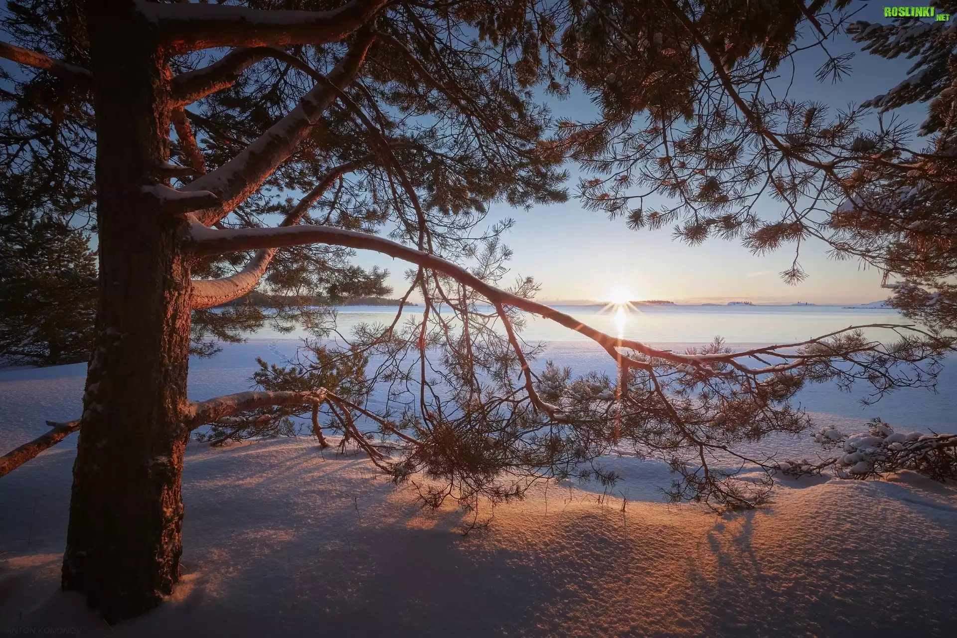 Rośliny: Zima, Drzewo, Sosna, Jezioro Ładoga, Promienie słońca, Karelia, Rosja