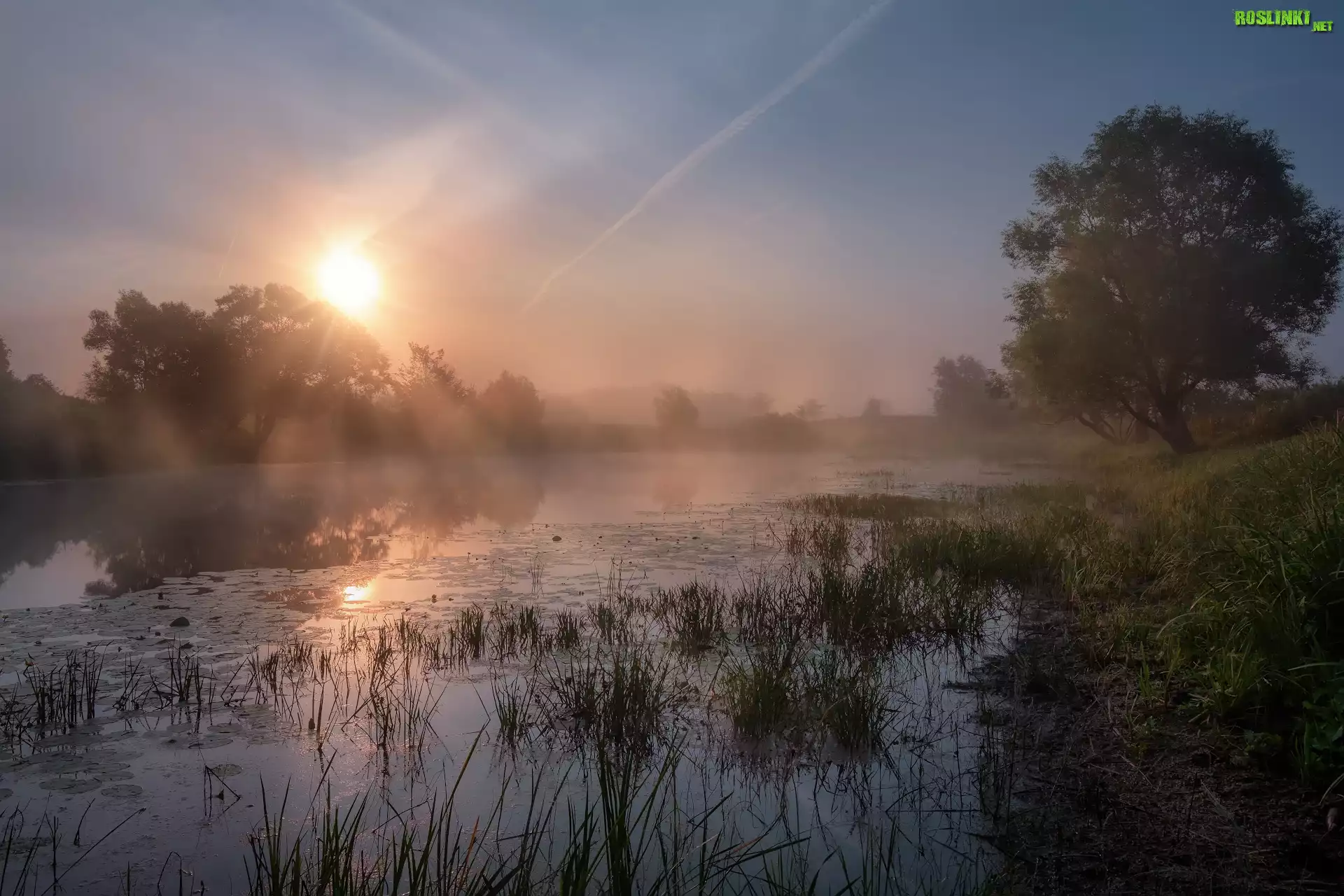 Staw, Drzewa, Szuwary, Wschód słońca, Bogolubowo, Obwód włodzimierski, Rosja