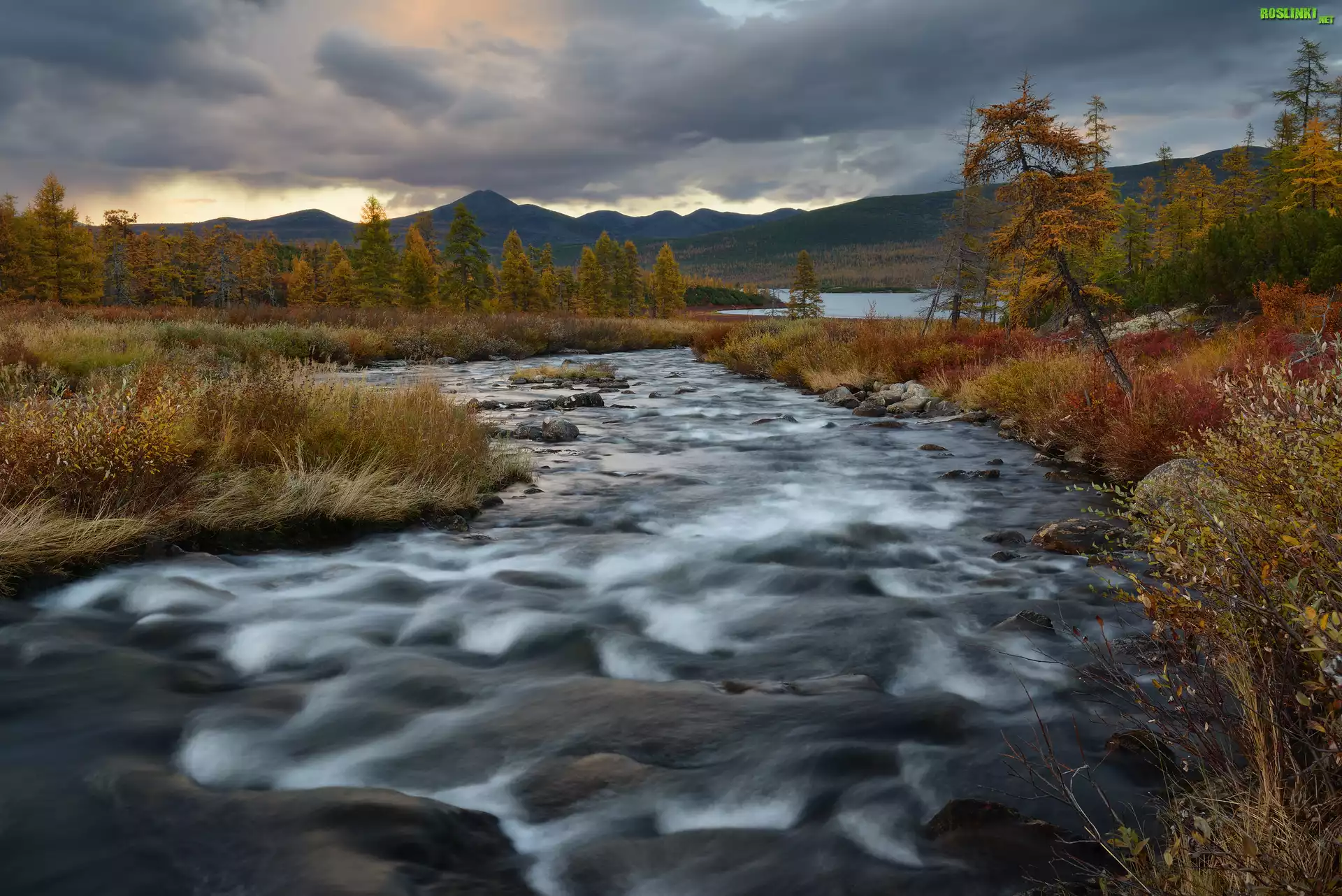 Rzeka Nevedomyy, Góry, Drzewa, Trawy, Chmury, Kołyma, Obwód magadański, Rosja