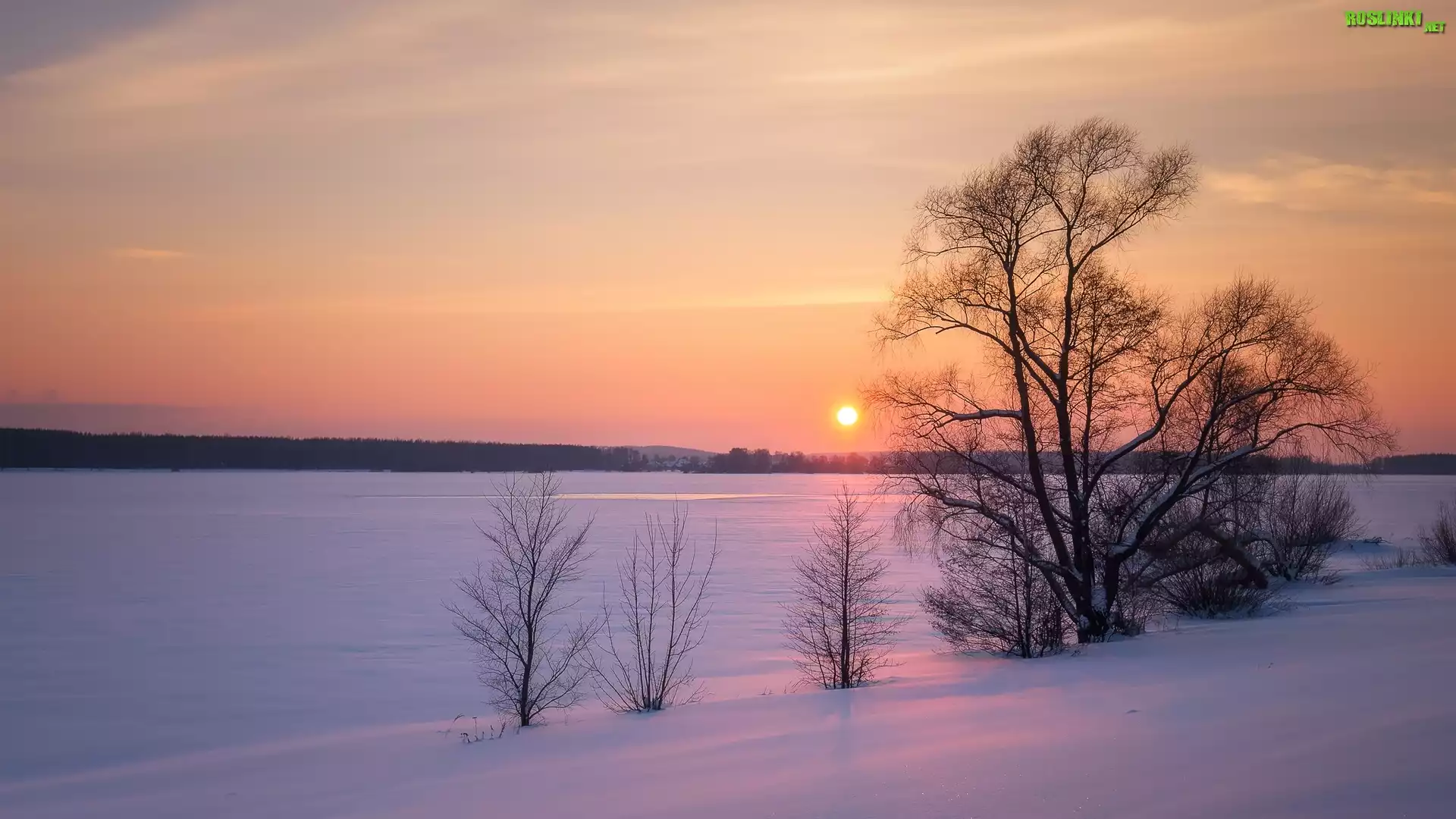 Rośliny: Zima, Rzeka Wołga, Drzewa, Zachód słońca, Miejscowość Kostroma, Rosja