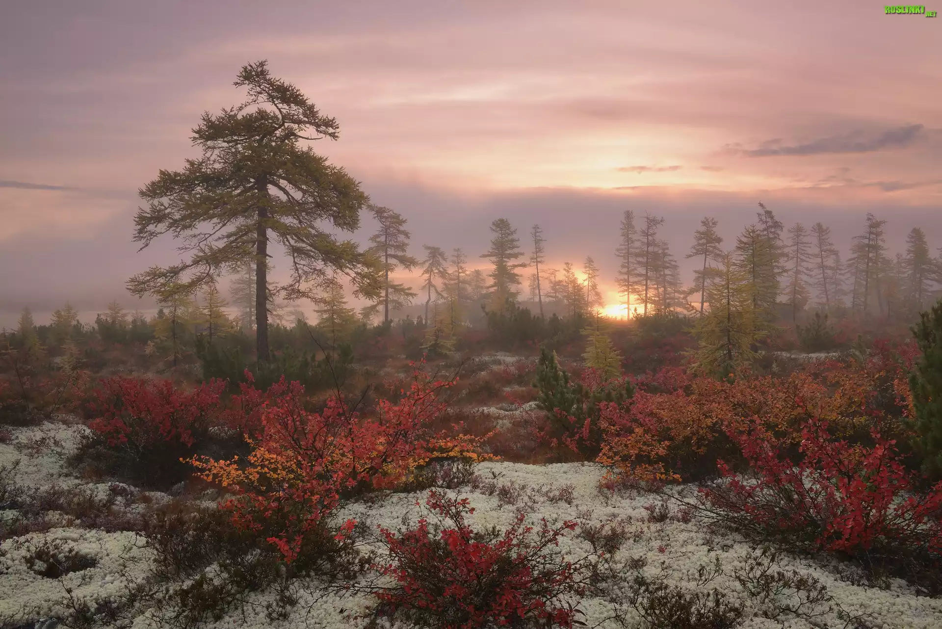 Rośliny: Jesień, Drzewa, Wschód słońca, Mgła, Kołyma, Obwód magadański, Rosja