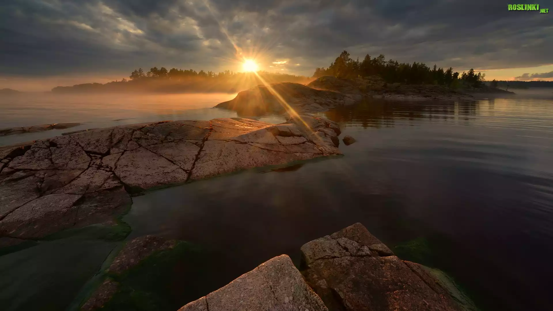 Jezioro Ładoga, Wyspy, Skały, Drzewa, Promienie słońca, Karelia, Rosja