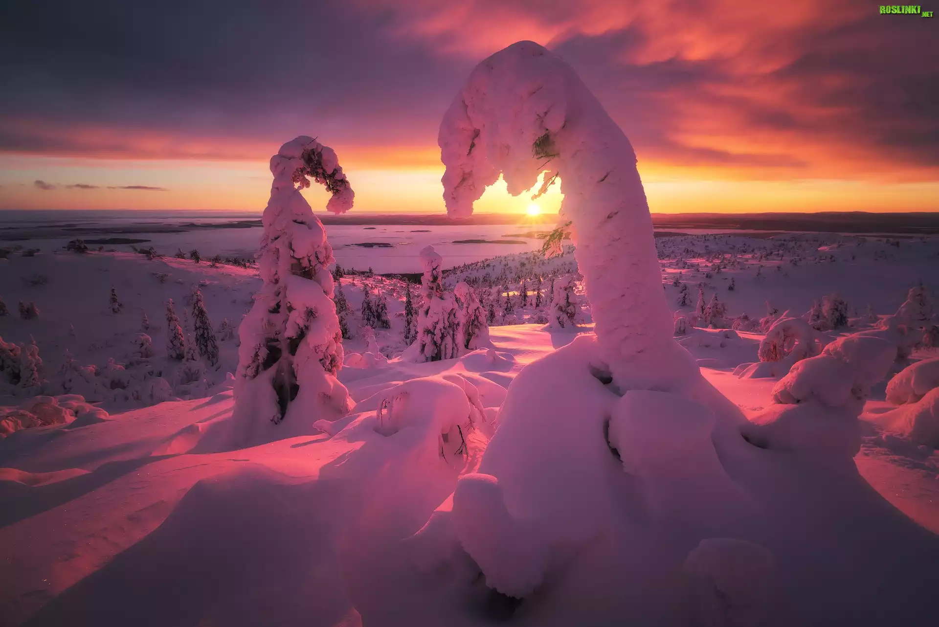 Zima, Drzewa, Zachód słońca, Zatoka Kandałaksza, Półwysep Kolski, Rosja