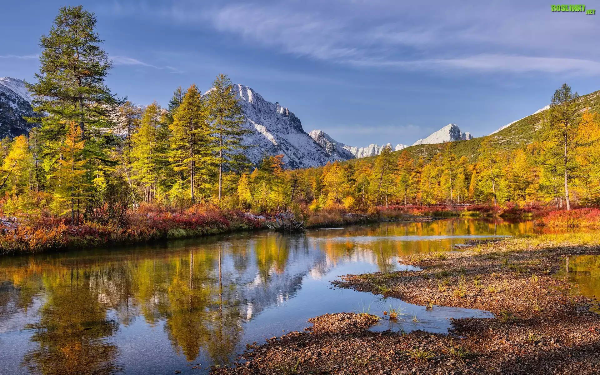 Rosja, Kołyma, Góry Kołymskie, Jezioro, Jesień, Drzewa, Roślinność