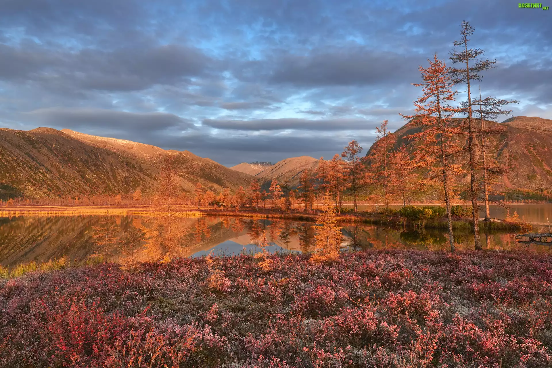 Jesień, Drzewa, Roślinność, Góry, Jezioro, Jack London, Kołyma, Obwód magadański, Rosja