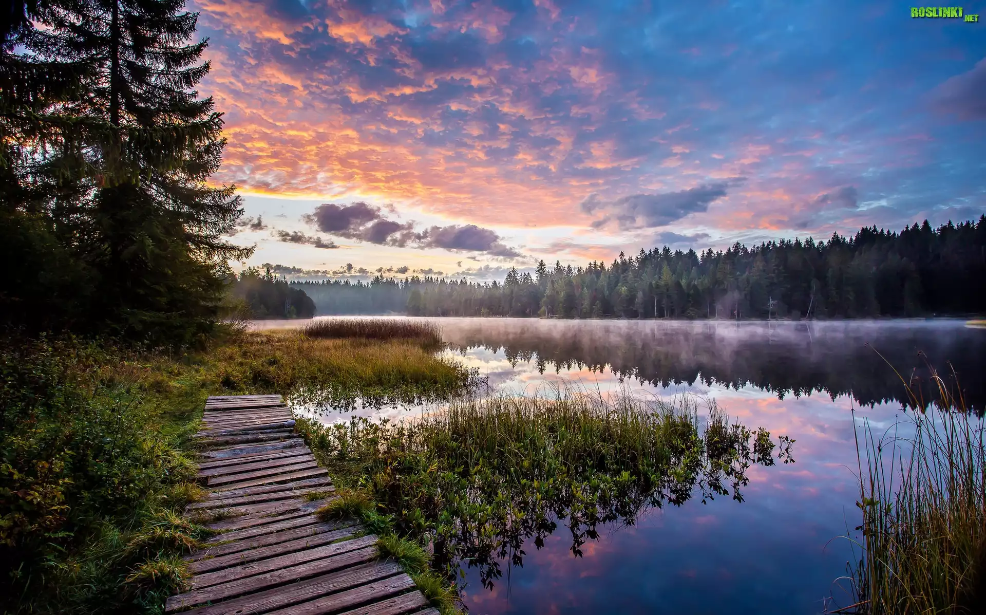 Rośliny: Wschód słońca, Mgła, Jezioro, Drewniany, Pomost, Las, Drzewa, Roślinność