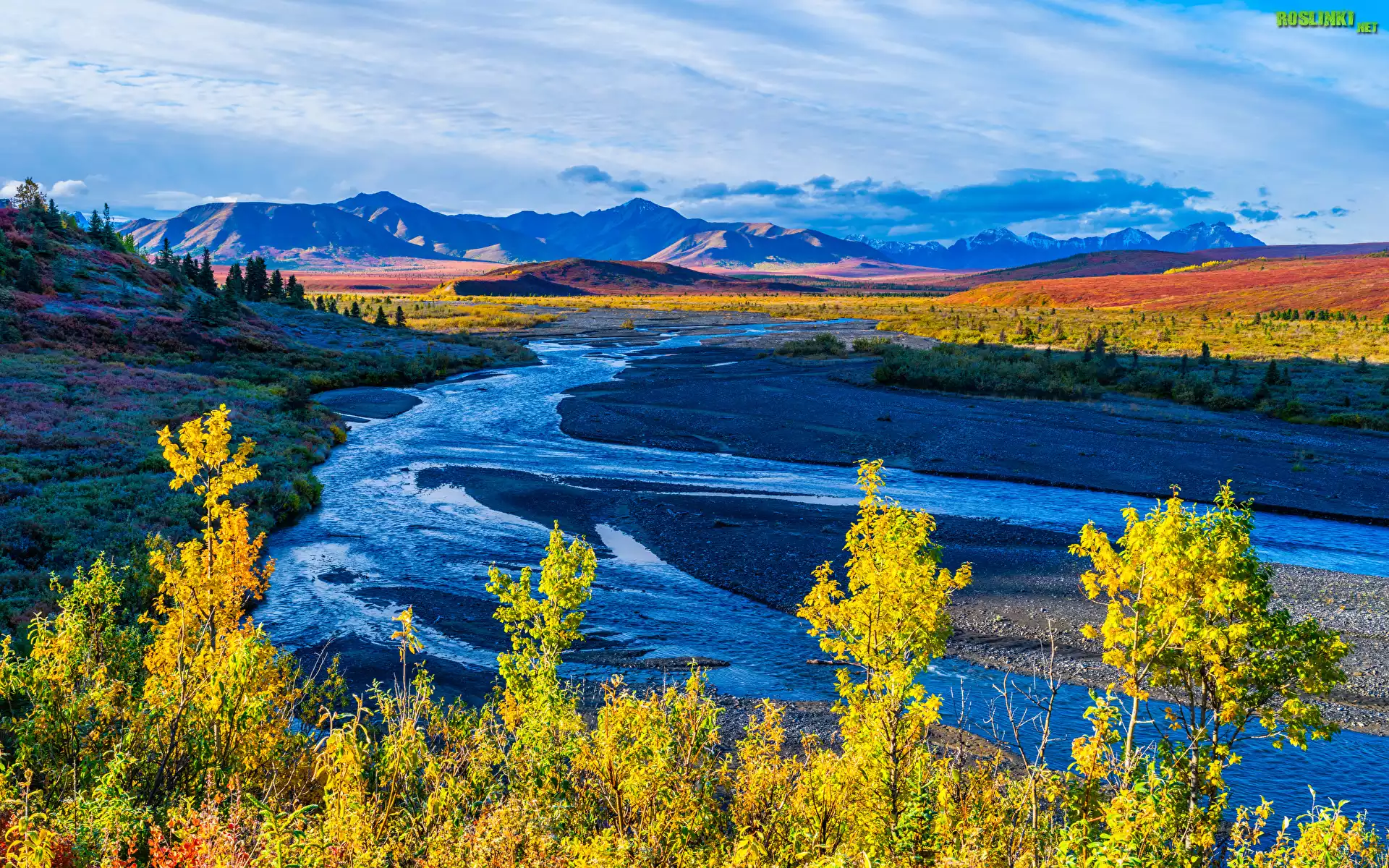 Park Narodowy Denali, Góry, Rzeka, Savage River, Drzewa, Roślinność, Jesień, Niebo, Alaska, Stany Zjednoczone |