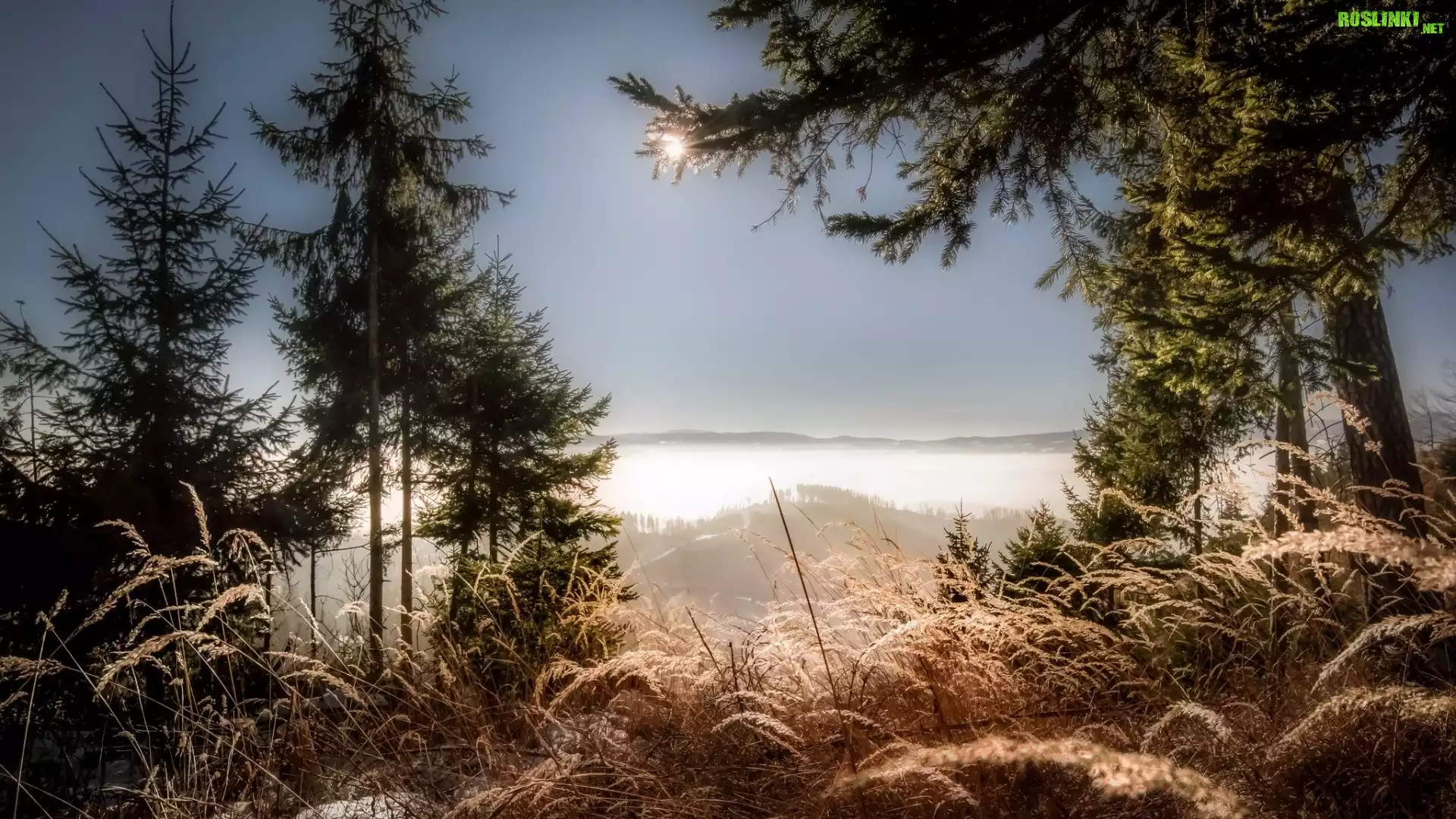 Rośliny: Rośliny, Trawa, Poranek, Drzewa, Mgła, Wzgórza