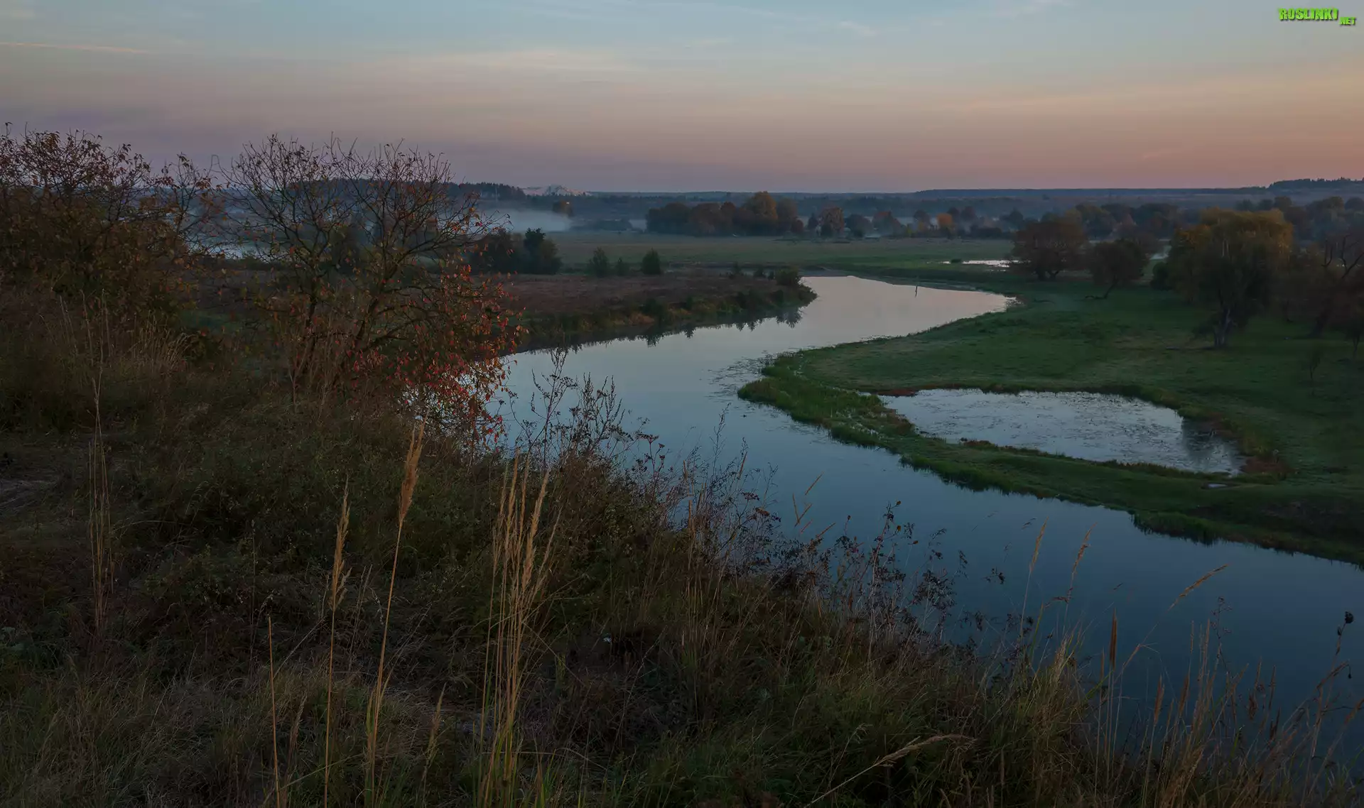 Rośliny: Rzeka, Rośliny, Trawa, Łąki, Drzewa, Wschód słońca, Mgła