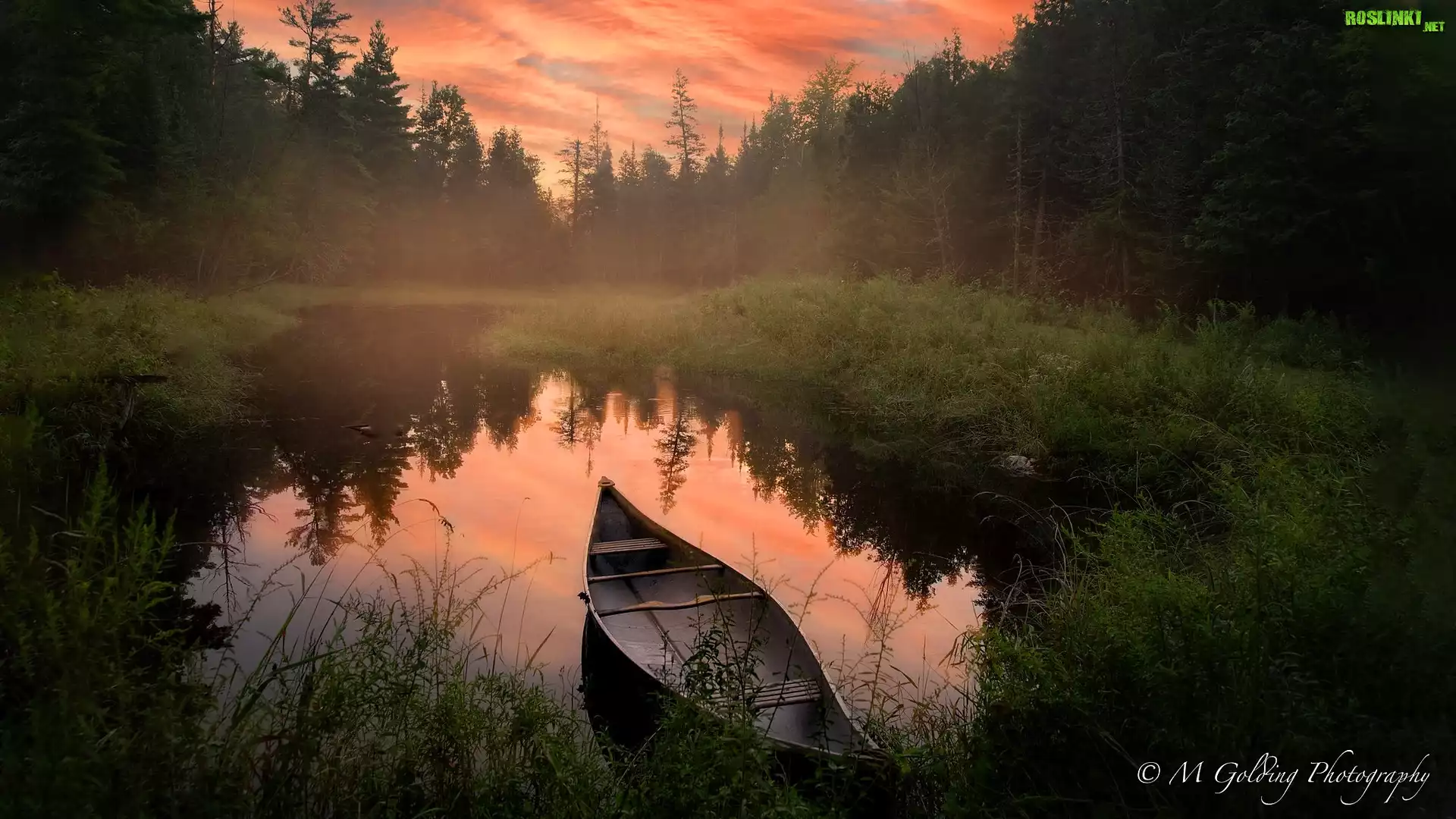 Staw, Czerwone, Niebo, Mgła, Łódka, Las, Drzewa, Rośliny