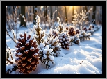 Zima, Las, Promienie słońca, Gałązki, Szyszki, Śnieg, Rośliny