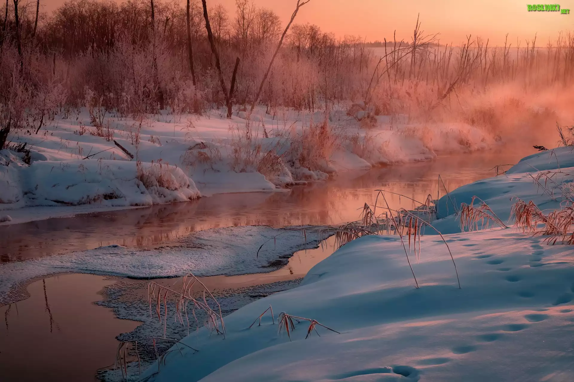 Rośliny: Rzeka, Rośliny, Krzewy, Drzewa, Śnieg, Mgła, Zima