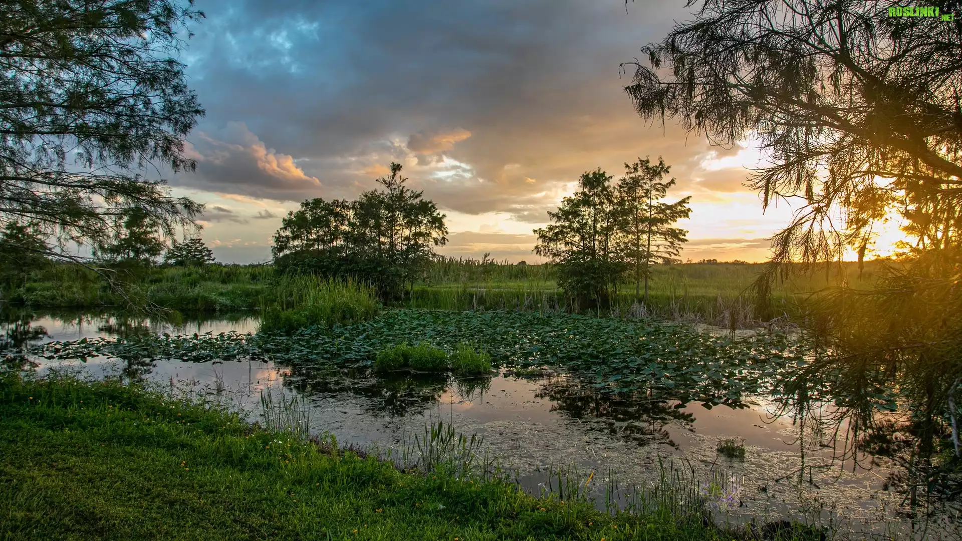 Rośliny: Staw, Drzewa, Trawa, Rośliny, Zachód słońca