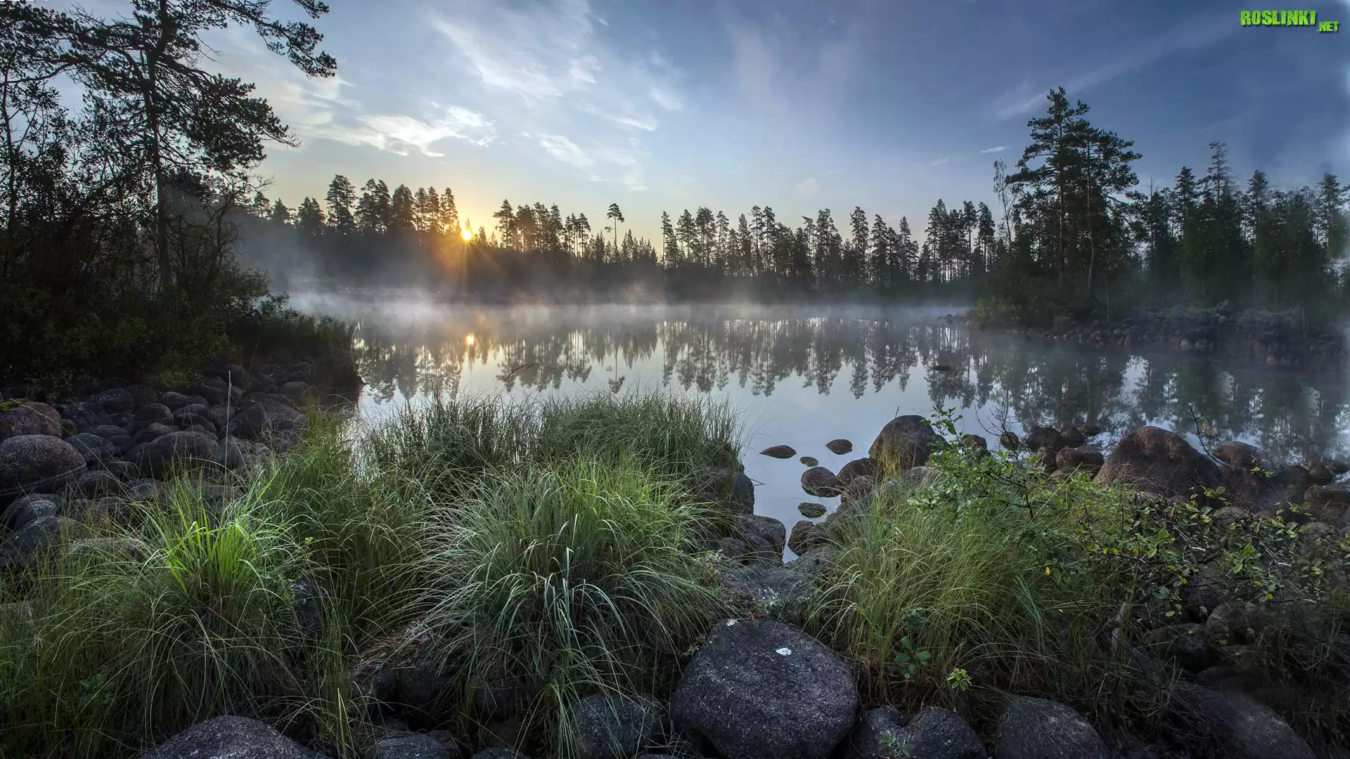 Rośliny: Rosja, Wschód słońca, Jezioro Ładoga, Kamienie, Drzewa, Trawa, Rośliny