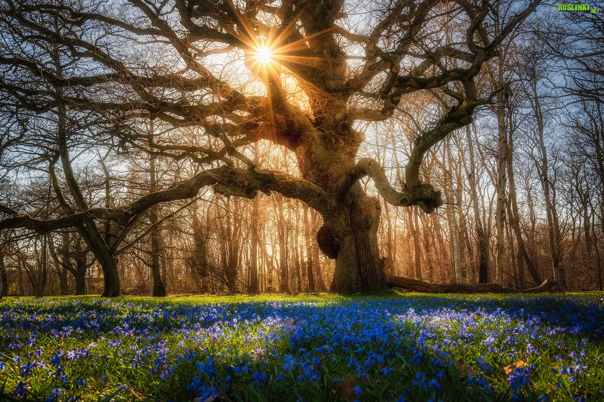 Rośliny: Polana, Rozłożyste, Drzewo, Niebieskie, Kwiaty, Promienie słońca
