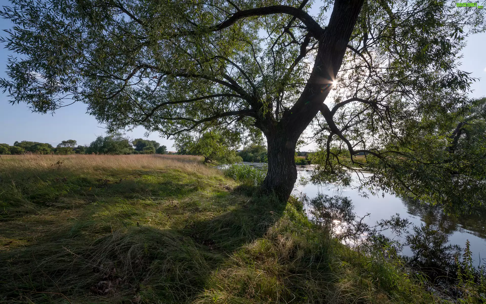 Rozłożyste, Drzewo, Rzeka, Trawa