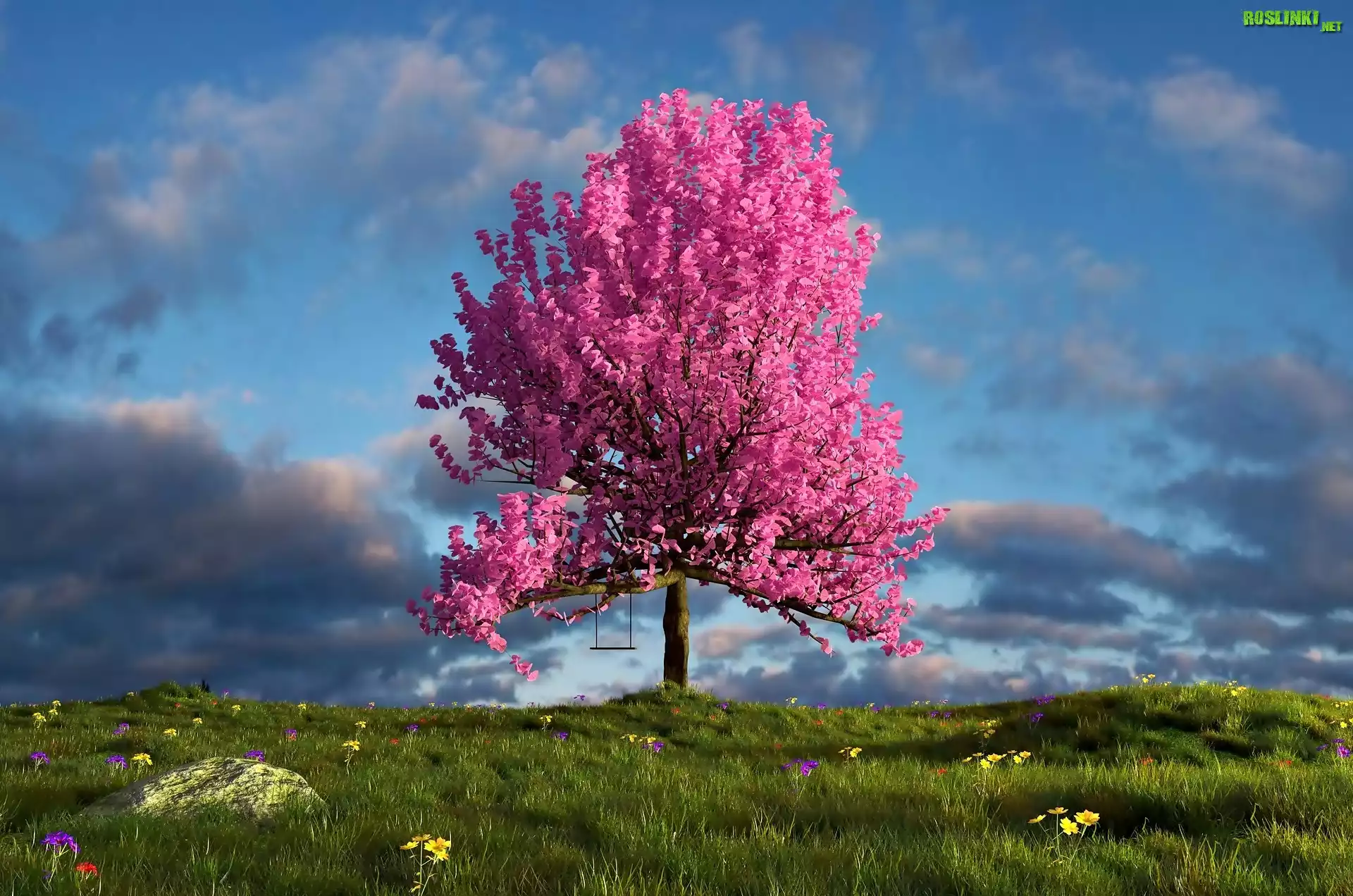 Rośliny: Różowe, Kwitnące, Drzewo, Łąka, Huśtawka, Niebo