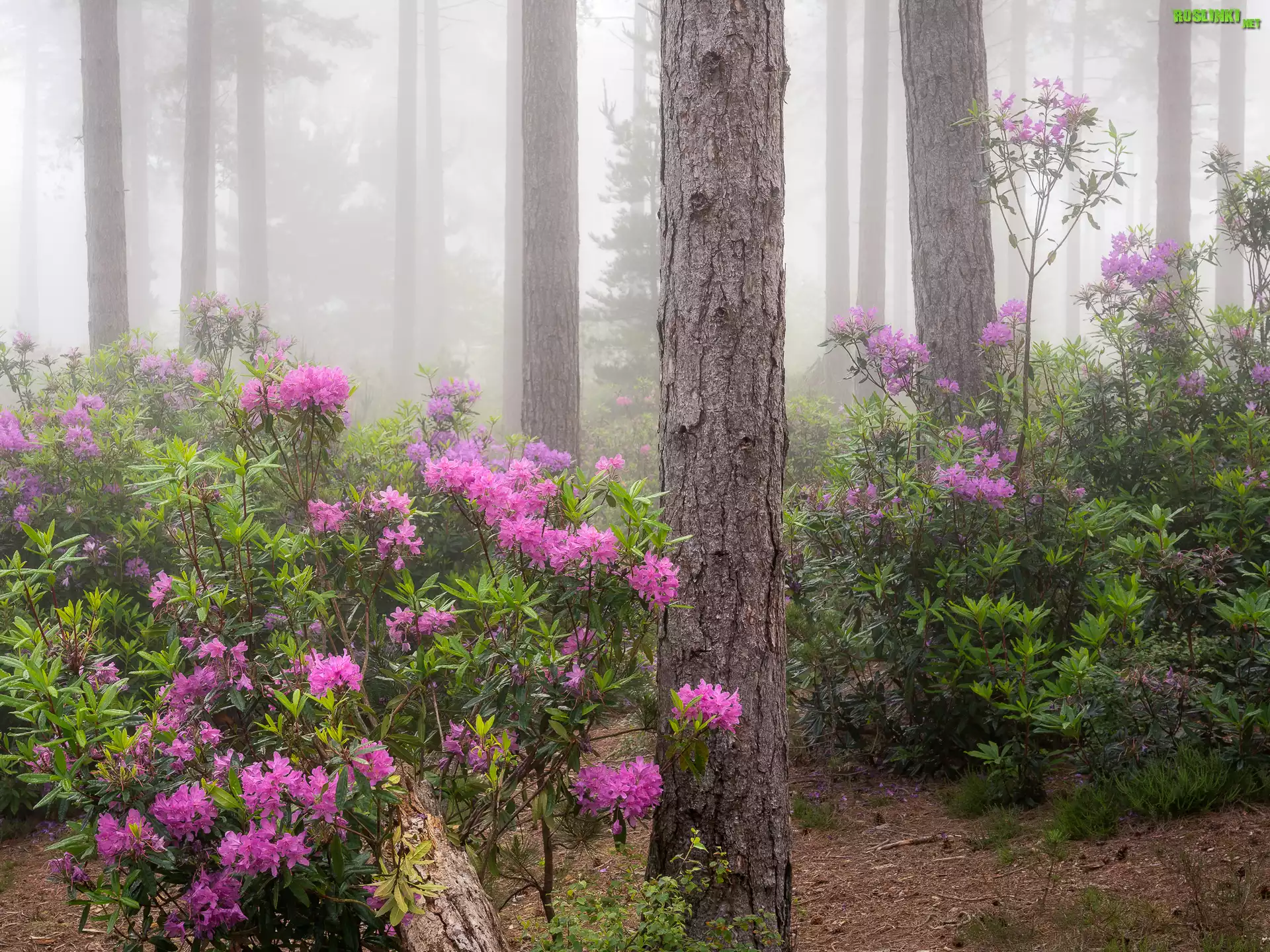 Rośliny: Las, Drzewa, Kwiaty, Różowe, Rododendrony, Mgła