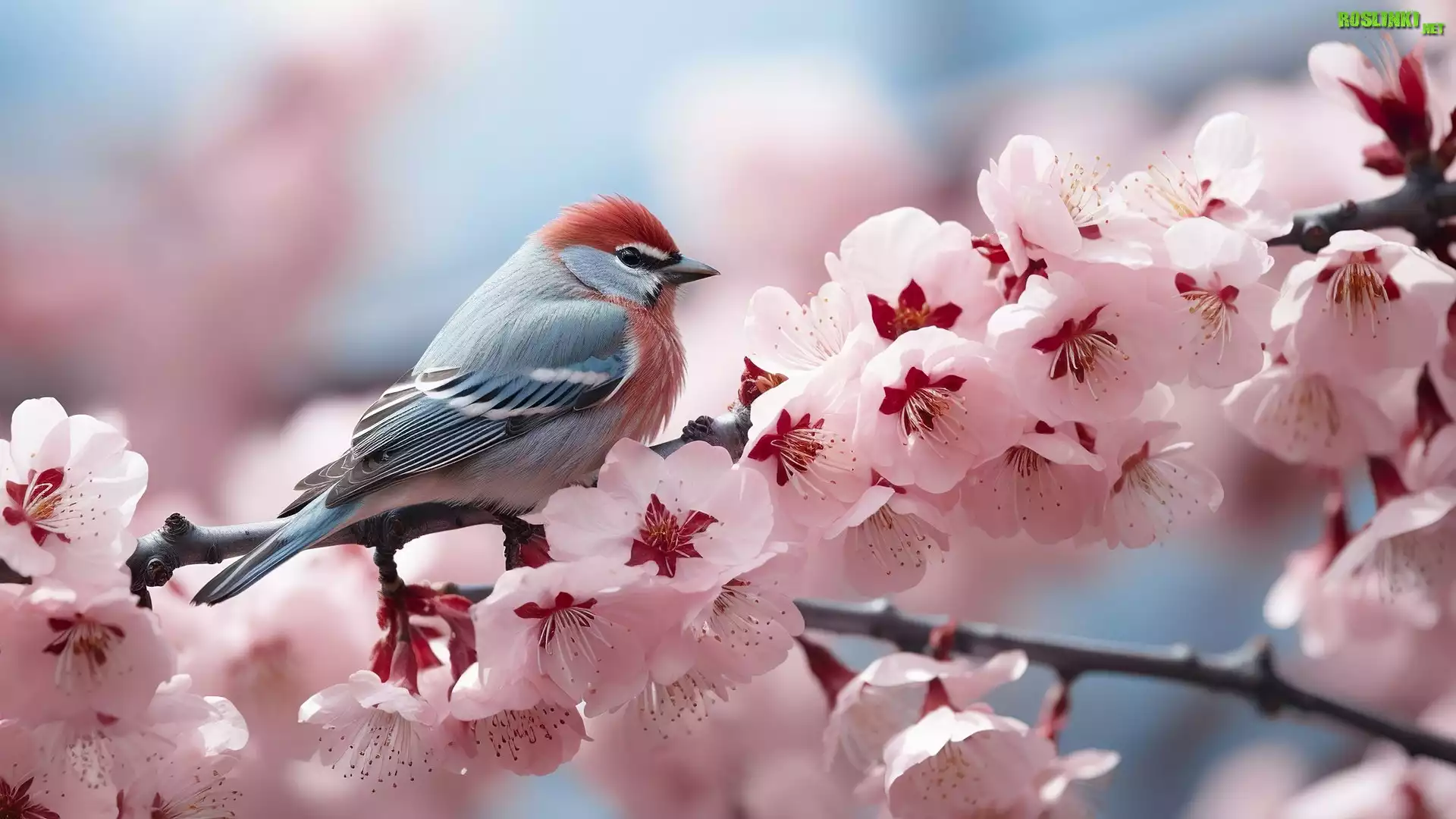 Rośliny: Ptak, Drzewo owocowe, Różowe, Kwiaty, Gałązki, Grafika