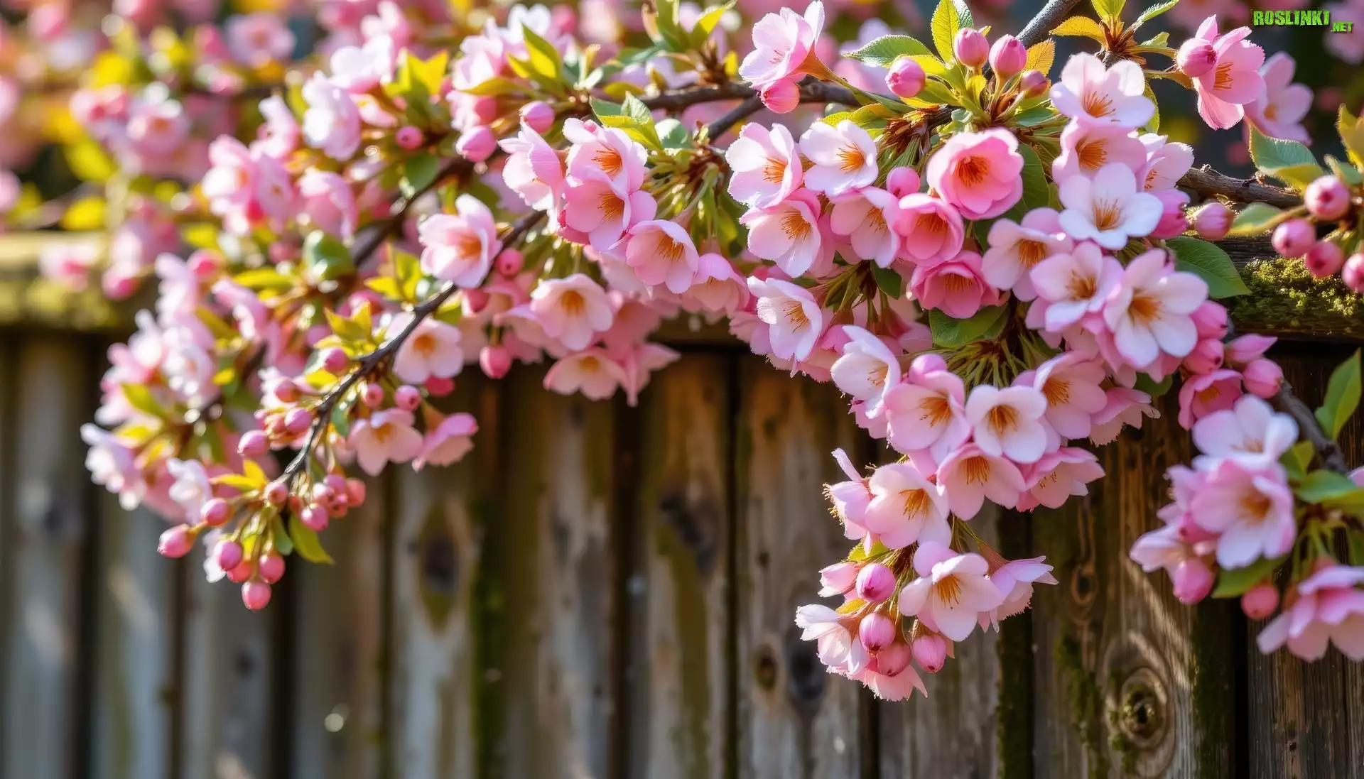 Rośliny: Różowe, Kwiaty, Gałązki, Drzewo owocowe, Drewniany, Płot, Grafika AI