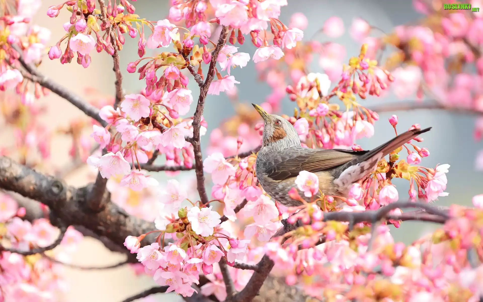 Ptak, Szczeciak rudouchy, Różowe, Kwiaty, Drzewo owocowe