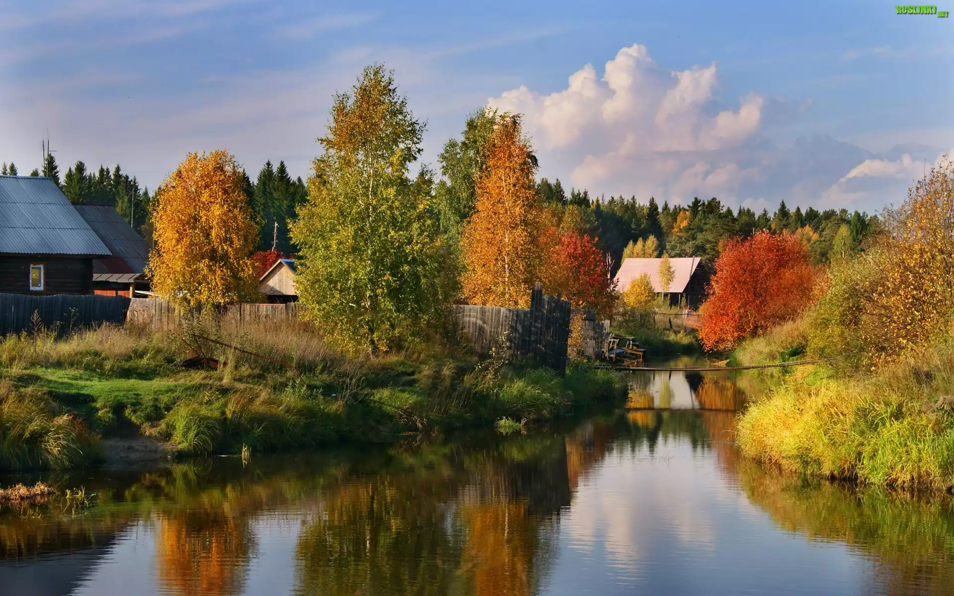 Rośliny: Rzeczka, Zabudowania, Las, Kolorowe, Drzewa, Jesień