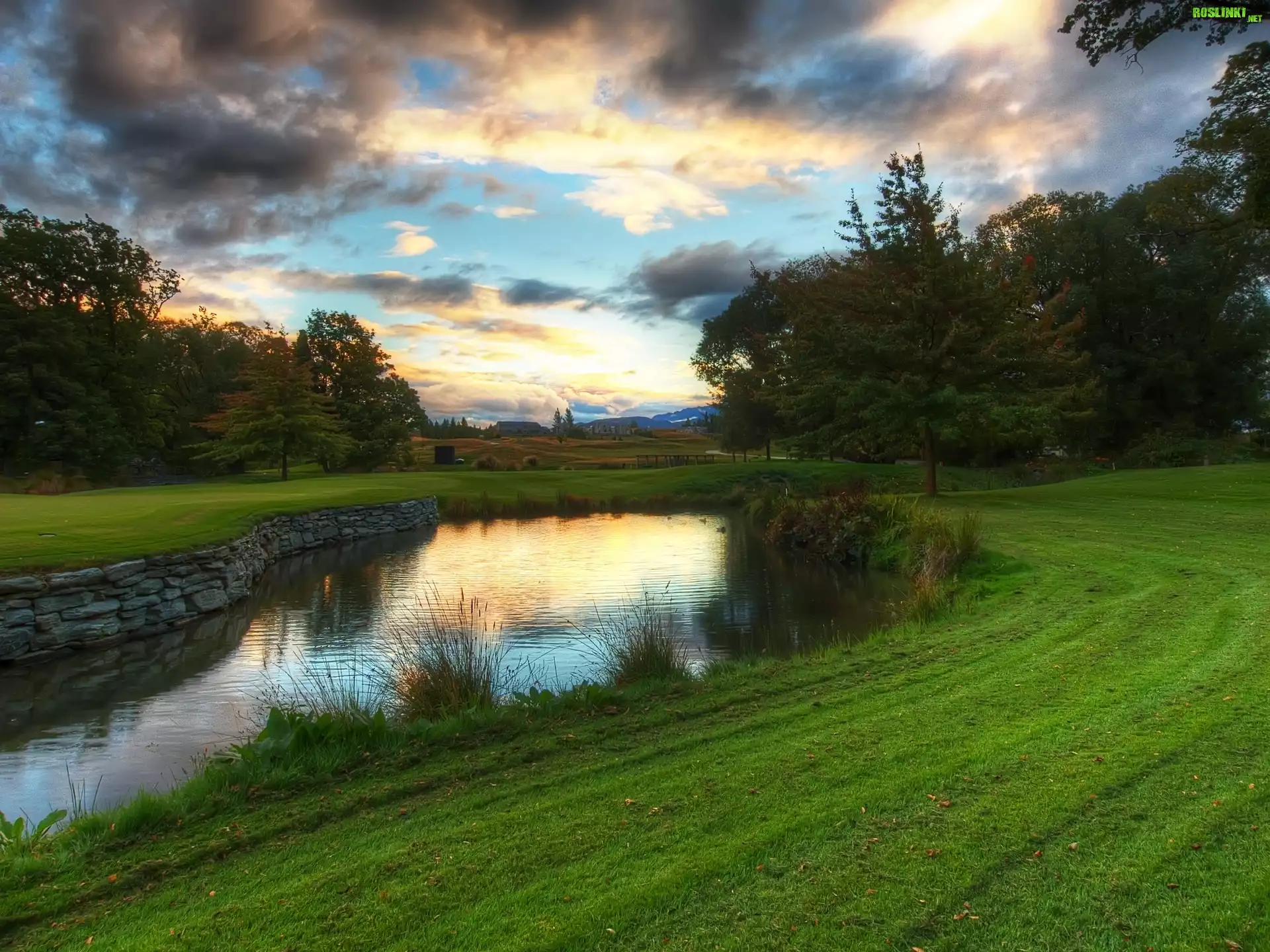 Rośliny: Rzeczka, Trawa, Drzewa, Chmury