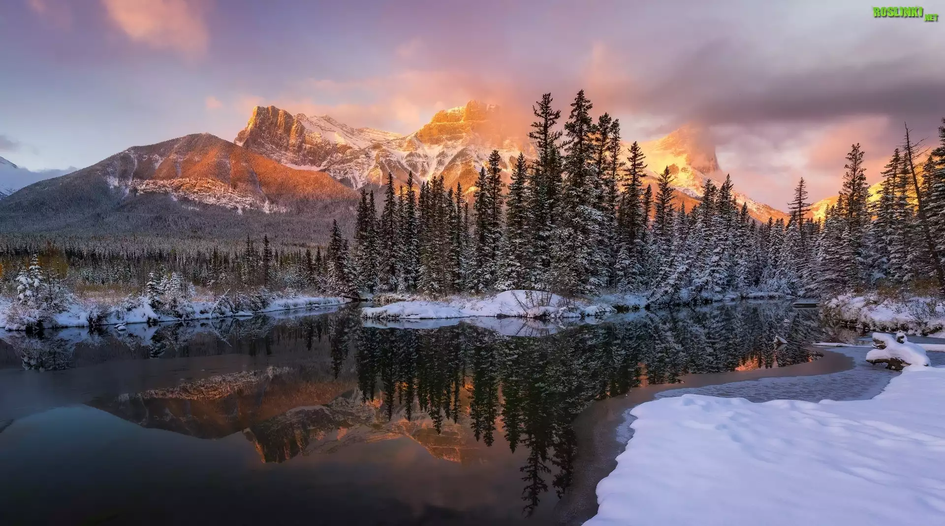 Rzeka Policeman Creek, Zima, Drzewa, Góry Canadian Rockies, Góra Mount Lawrence Grassi, Canmore, Prowincja Alberta, Kanada |