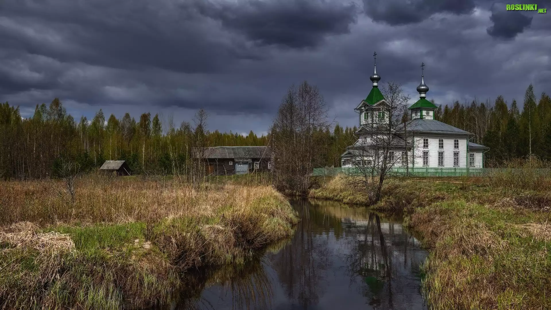 Rośliny: Cerkiew, Rzeka, Chmury, Łąka, Drzewa