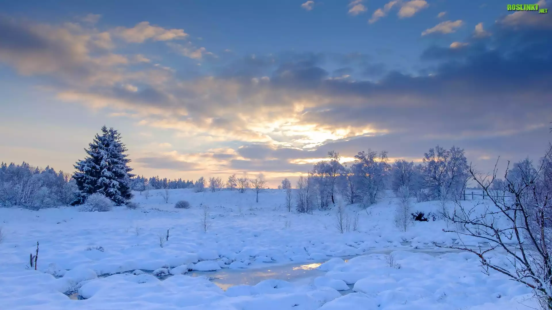 Rośliny: Zima, Rzeka, Ośnieżone, Drzewa, Pole, Wschód słońca, Chmury
