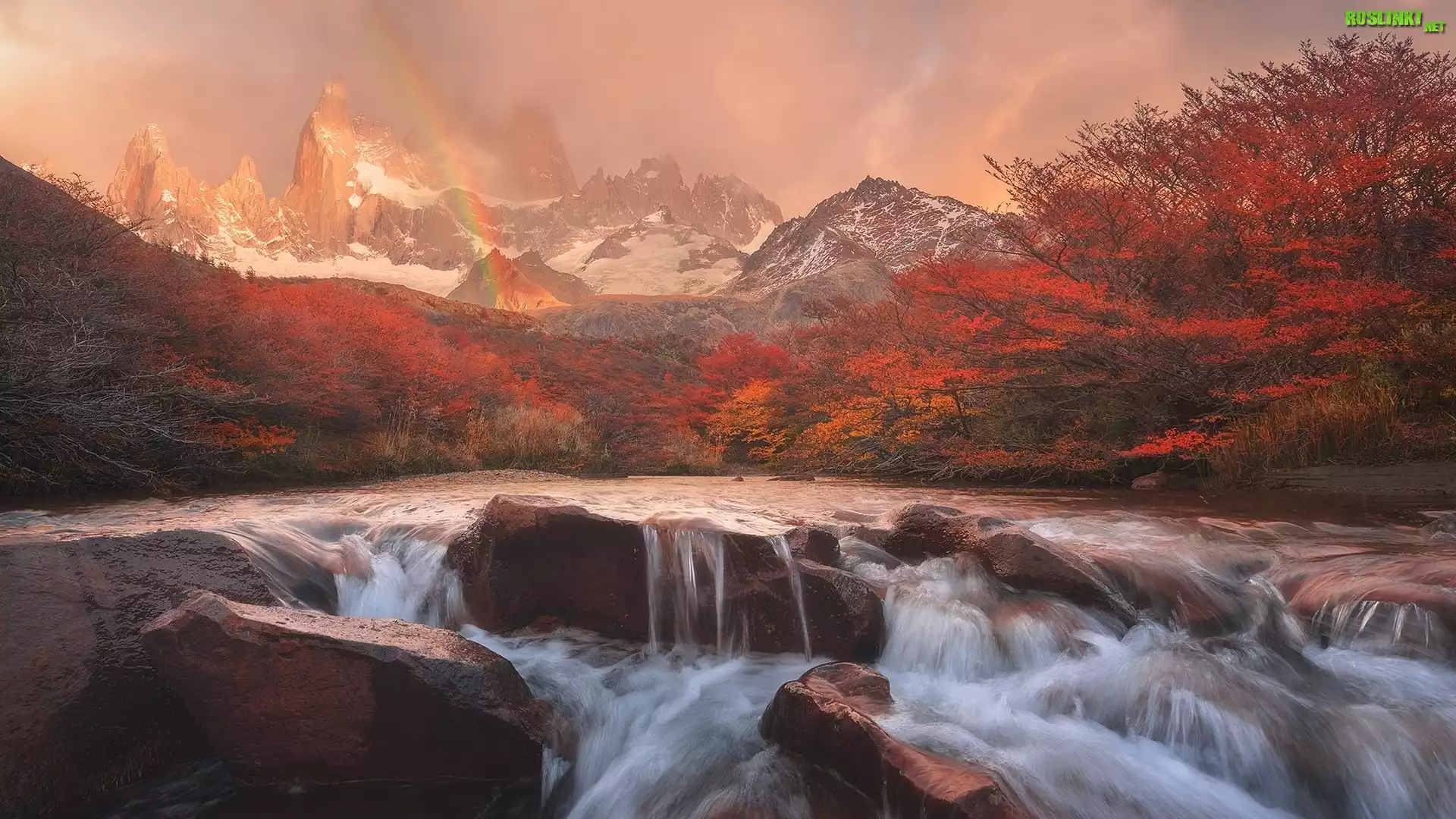 Jesień, Góry Andy, Tęcza, Czerwone, Drzewa, Kamienie, Głazy, Rzeka, Park Narodowy Los Glaciares, Argentyna |
