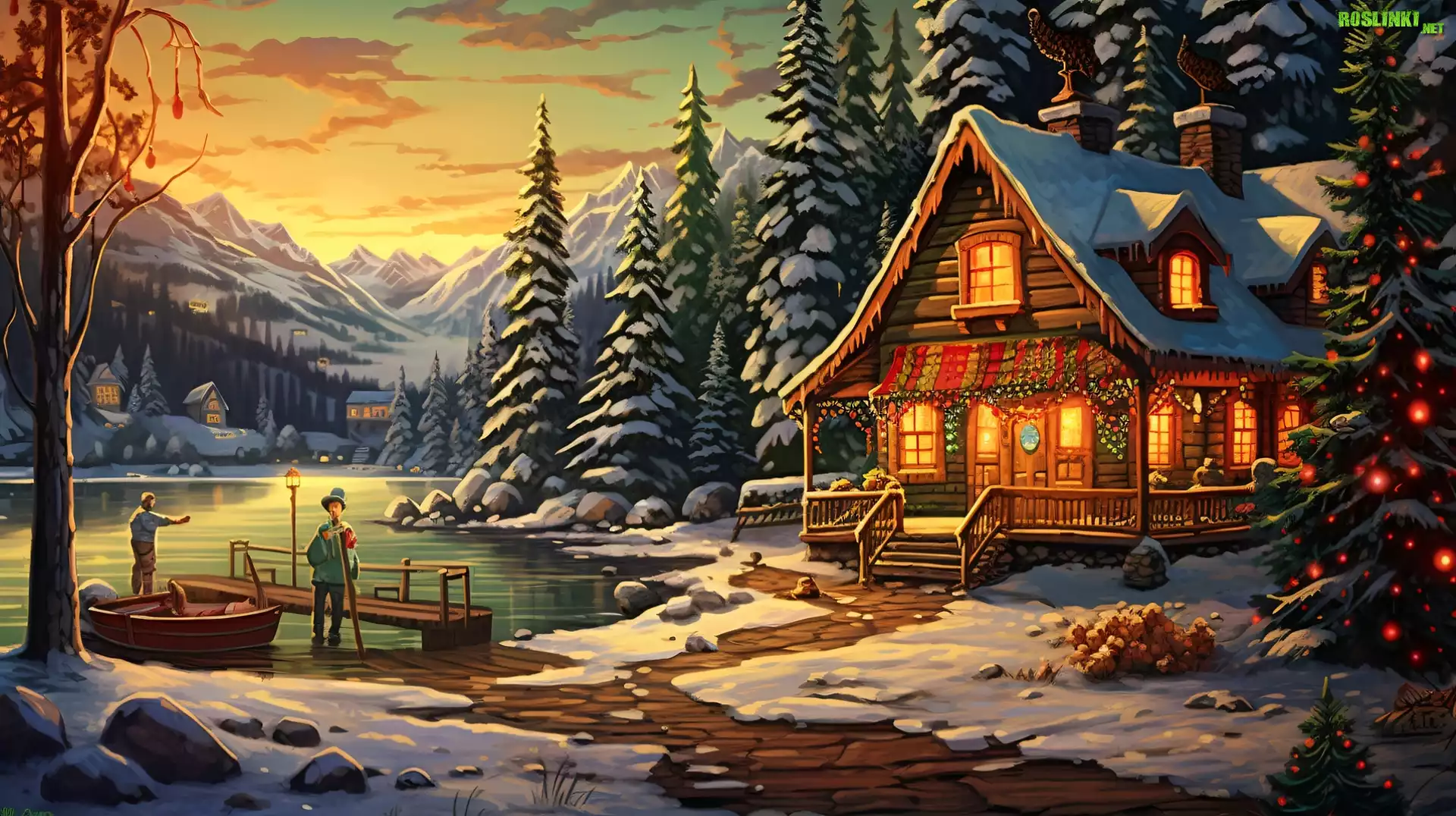 Zima, Góry, Oświetlony, Udekorowany, Domy, Drzewa, Las, Choinki, Rzeka, Pomost, Łódka, Boże Narodzenie, Grafika |
