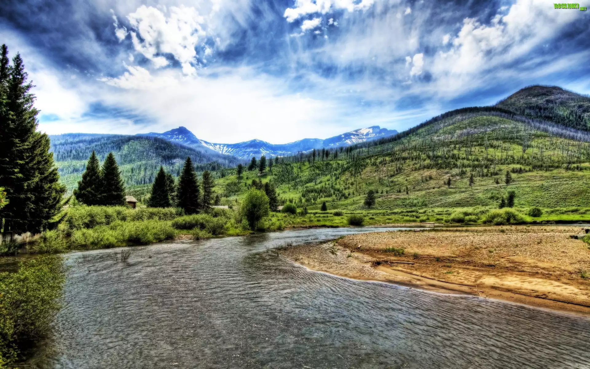 Rośliny: Rzeka, Góry, Drzewa, Chmury