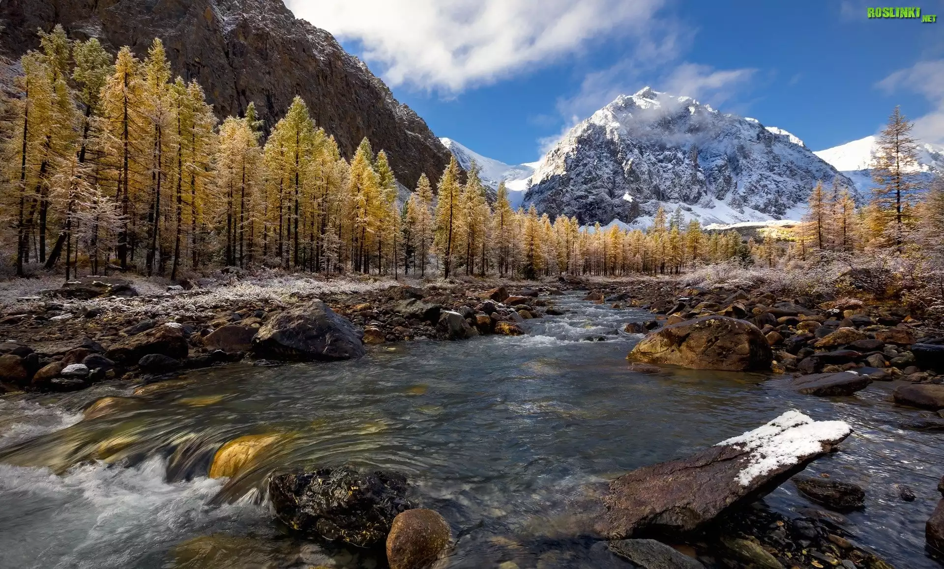 Rośliny: Rzeka, Kamienie, Góry, Drzewa, Śnieg
