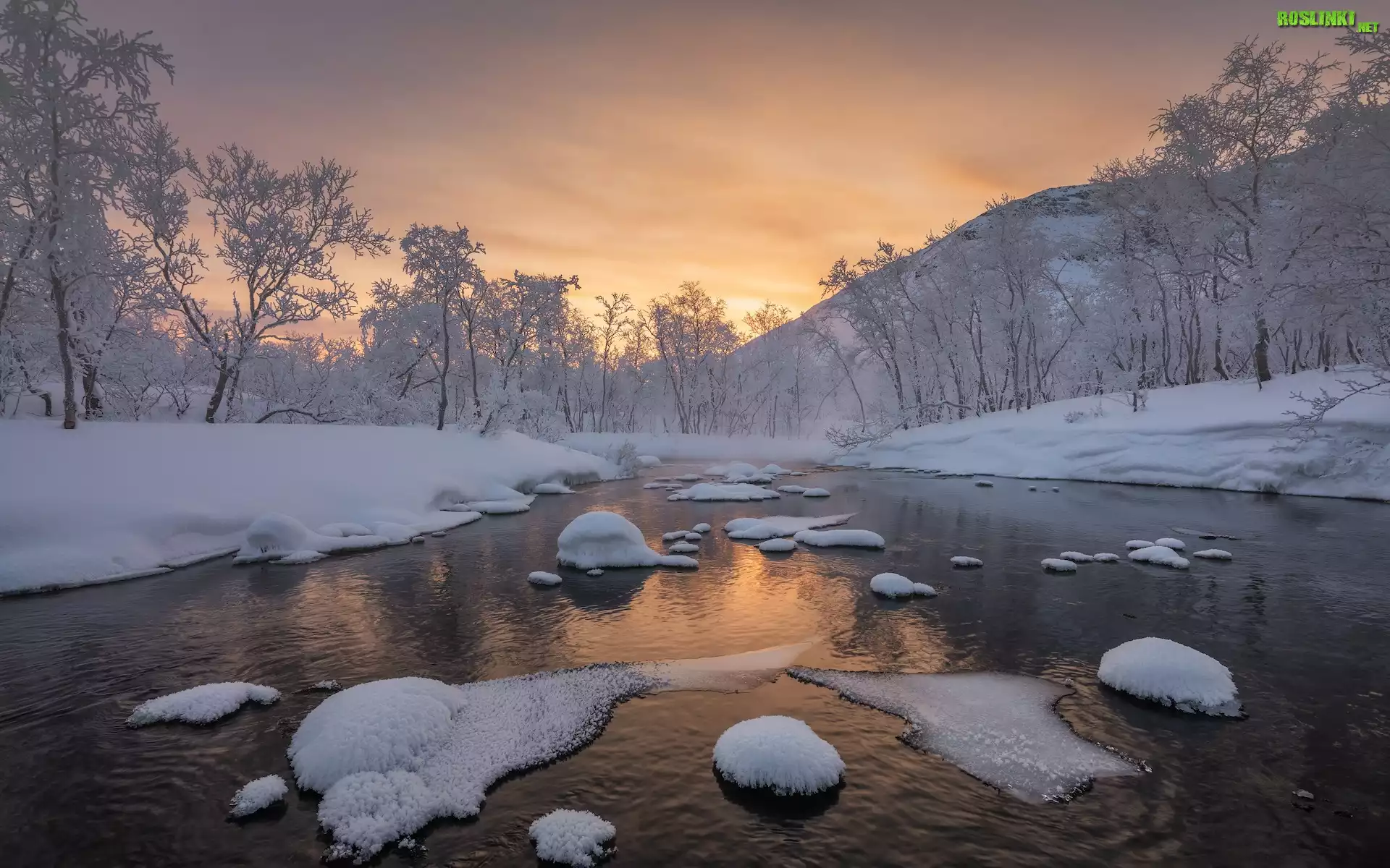 Rośliny: Zima, Rzeka, Drzewa, Ośnieżone, Góry