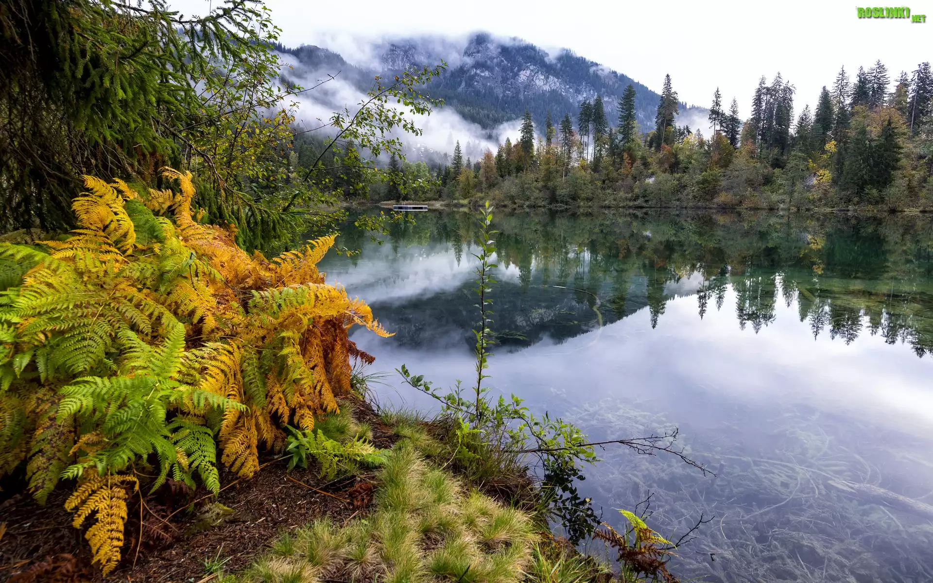 Rośliny: Rzeka, Góry, Mgła, Drzewa, Paprocie
