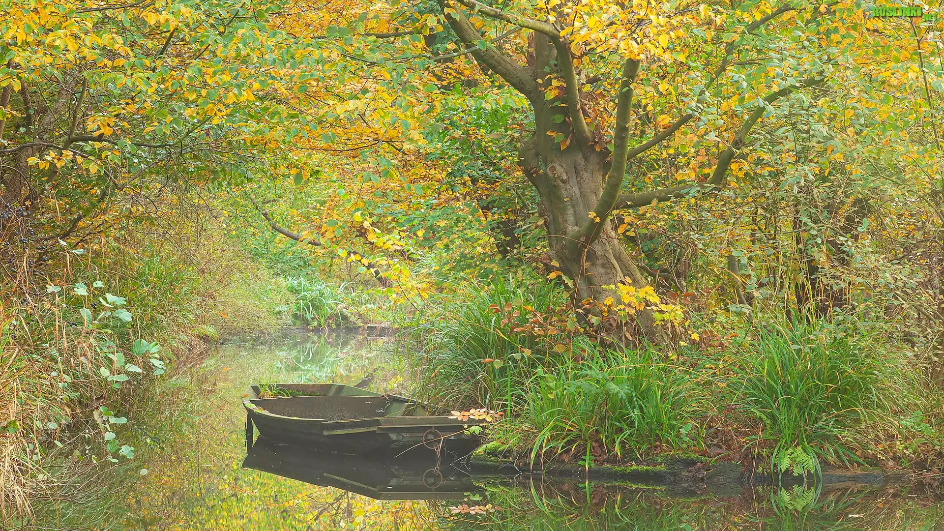Rośliny: Rzeka, Łódka, Drzewa, Rośliny