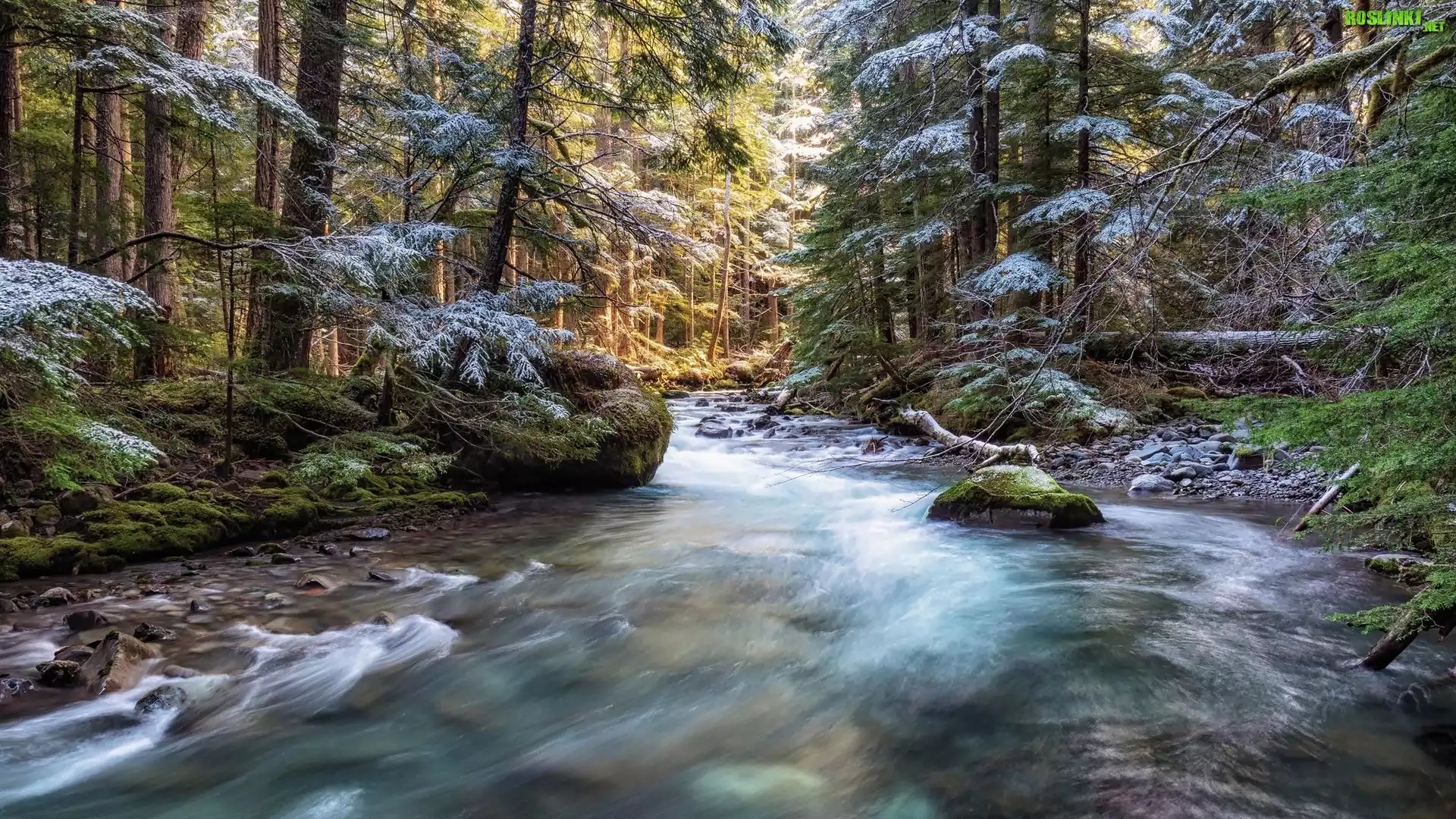 Rośliny: Rzeka, Las, Ośnieżone, Drzewa, Kamienie