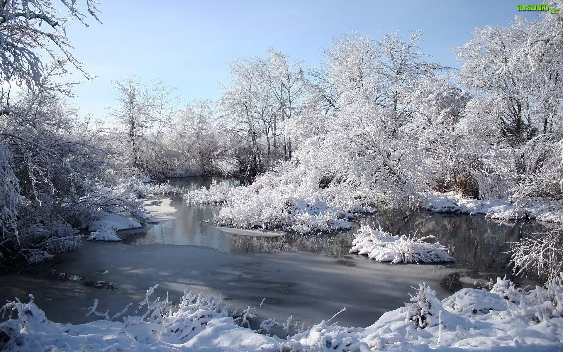 Rośliny: Rzeka, Ośnieżone, Drzewa, Zima