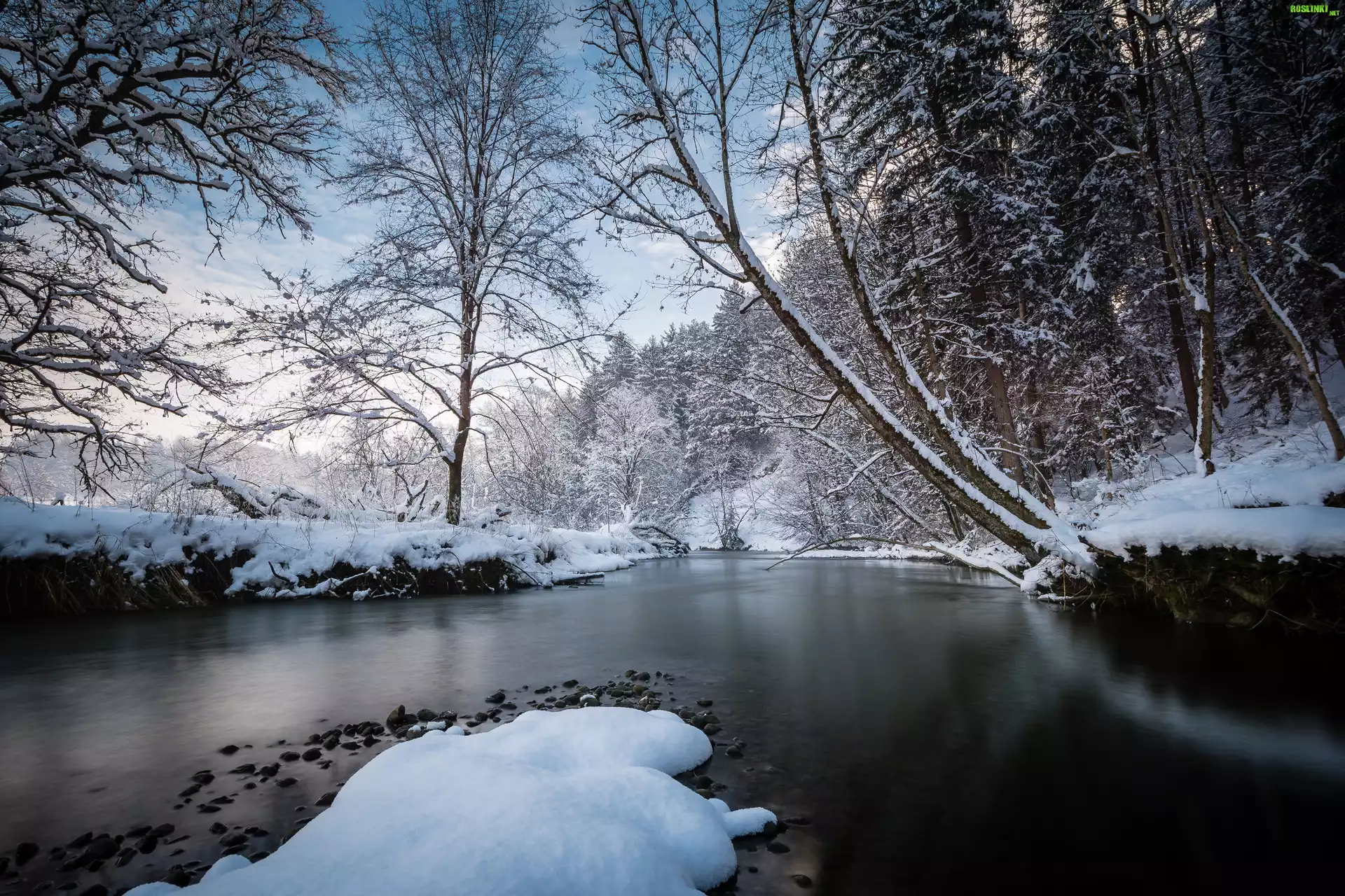 Rośliny: Rzeka, Las, Pochylone, Drzewa, Zima