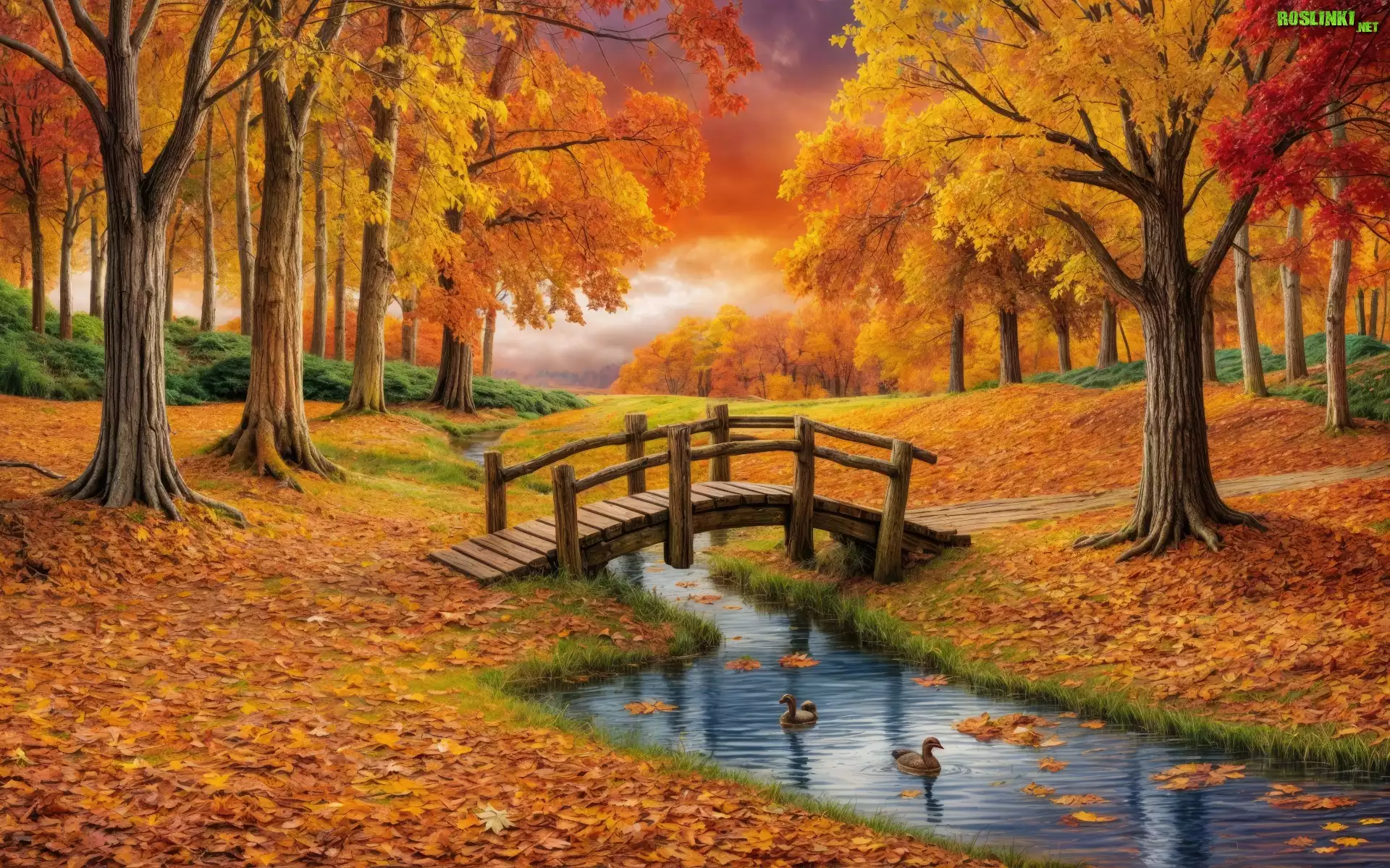 Rośliny: Jesień, Pożółkłe, Drzewa, Rzeka, Strumień, Most, Grafika
